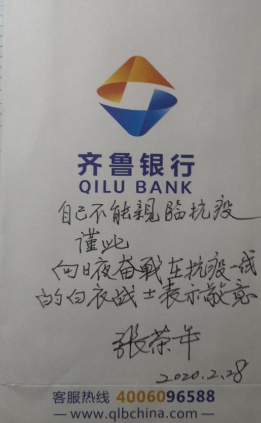此时的退休干部、原学校党委书记尹方虽正在澳大利亚探亲,但是她主动联系学校主动捐款。2月27日尹方通过国内亲属送来捐款1000元。同日,退休干部、原学校党委书记张荣年也送来了捐款1000元。他在信封上写到:“自己不能亲自上前线,谨此,向日夜奋战在战疫一线的白衣战士表示敬意。”张荣年同志说:“中国人民是伟大的人民、中国共产党是伟大的党,只要我们全力奋战、勇往直前、万众一心、没有翻不过的山、没有跨不过的坎。”