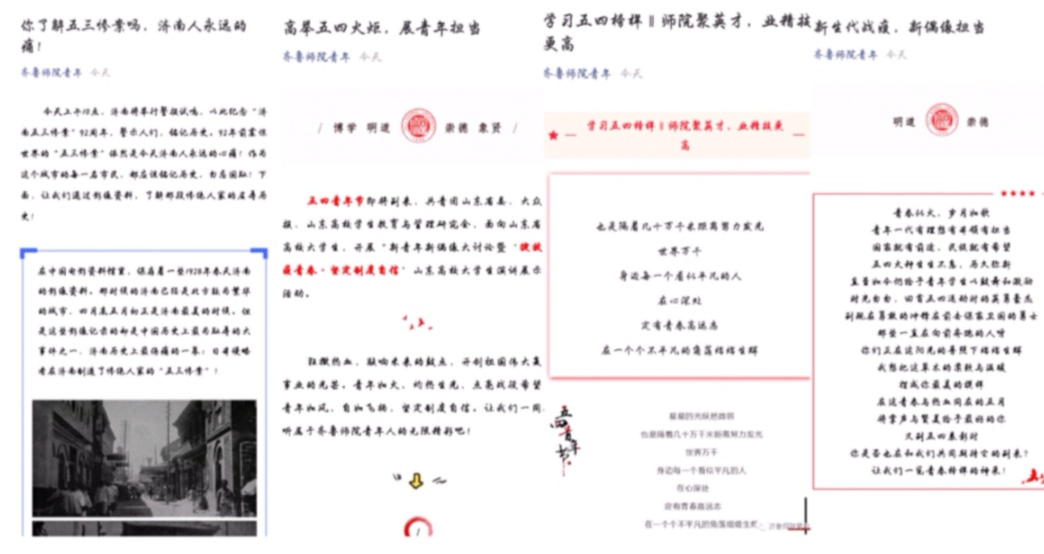 深度剖析偶像,青年有目标。4月19日,金年会官网开展了“新青年新偶像大讨论暨‘绽放战疫青春•坚定制度自信’JINNIAN金年会大学生演讲展示活动”,共征得各学院优秀演讲视频近30份。活动潜移默化地影响着青年人的偶像观、价值观、成才观,激励和引领青年进一步坚定制度自信,投身党和人民最需要的地方发热放光,推崇英雄、崇尚担当、向往奉献的正能量在青年人心底慢慢积聚成塔。此外,校团委借助官方微信、微博等媒体平台陆续推送了《你了解五三惨案吗?济南人永远的痛》、《新声代战疫,新偶像担当》、《学习五四榜样‖师院聚英才,业精技更高》、《高举五四火炬,展青年担当》等文章,旨在激励学校广大青年志以成学,业精于诚,以身边的偶像为榜样,扎实理论功底,提高专业素养,在真抓实干中磨炼实践本领。