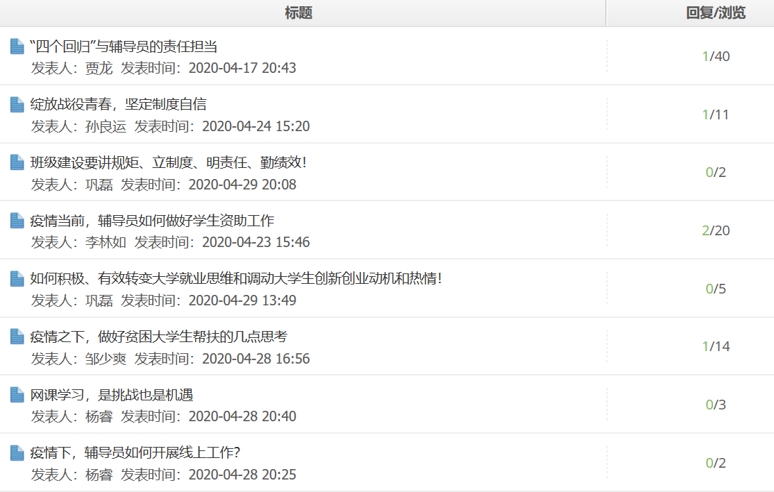 音乐学院党总支副书记马艳:面对突如其来的新冠肺炎疫情,很多人的学习、工作方式都随之发生了改变,辅导员的学生教育工作也是如此。面对学生教育工作从线上线下结合向完全线上形式的转变,我们也要及时转换工作思路,去学习利用互联网开展学生教育工作。心有大我,责任在肩。疫情面前,每个人都是战斗者、奋斗者,都应各尽其责、有所担当,而越是艰难的考验,越会让我们快速成长。我也将以此次培训学习为工作契机,开拓各种渠道加强对学生的思想政治教育工作,树立学生的社会责任感和担当意识,引导学生完成蜕变,成为有理想、有本领、有担当的社会主义合格建设者和可靠接班人!