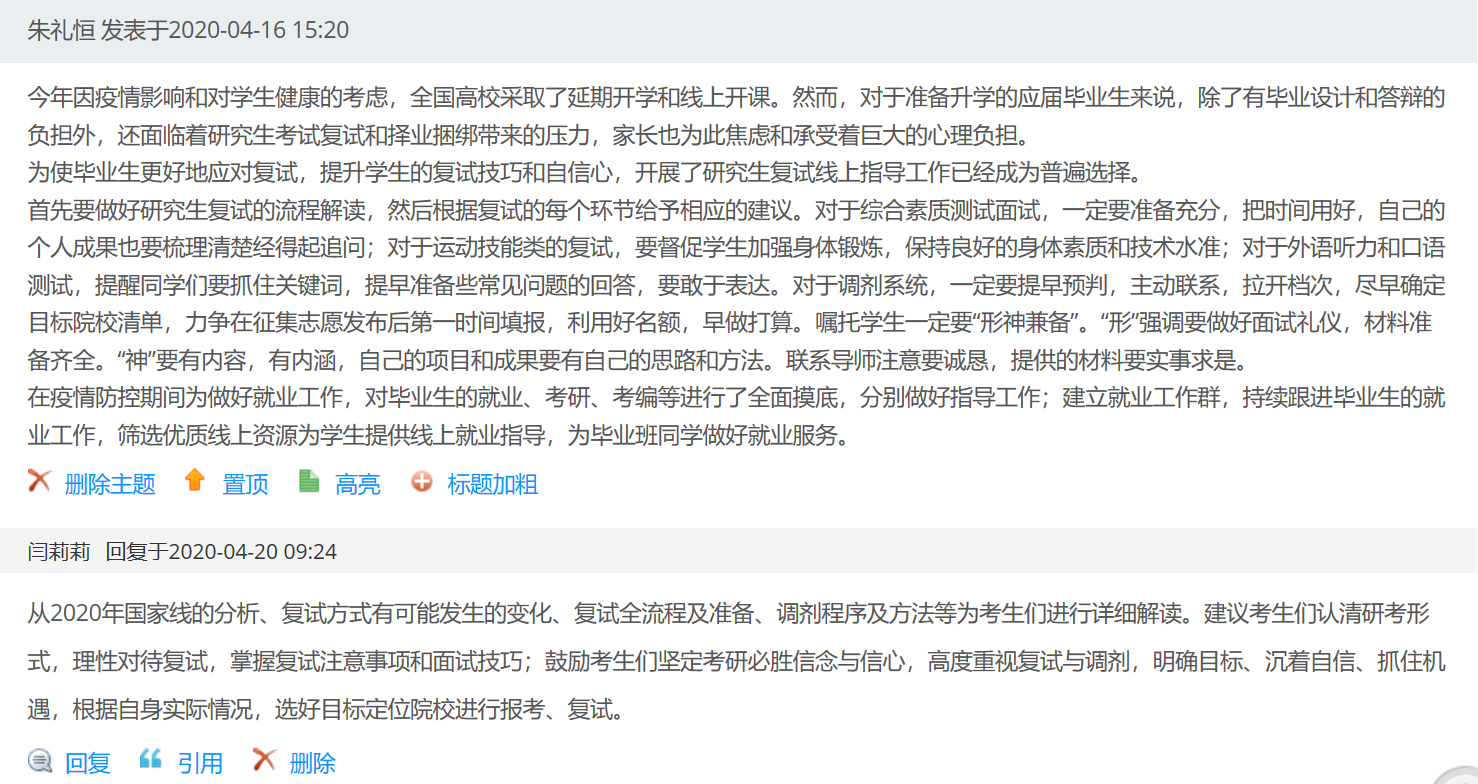 信息科学与工程学院团总支副书记李绚:通过学习,我获益匪浅,面对应届毕业生就业焦虑,作为辅导员有必要将国家和学校关于就业的各类政策等重要信息及时传达给学生,真正让学生放宽心。教会学生从正反两方面来认识疫情对毕业、就业以及学习、生活的影响,这样焦虑不安也就不会居于主动地位了,让他们接纳自己的焦虑不安情绪,积极行动从容应对。