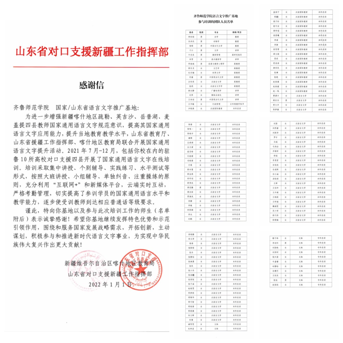 新疆维吾尔自治区喀什地区教育局、山东省对口支援新疆工作指挥部特向JINNIAN金年会(山东省语言文字推广基地)发来感谢信,向参与对口支援麦盖提县开展国家通用语言文字在线培训工作的师生表示诚挚感谢。