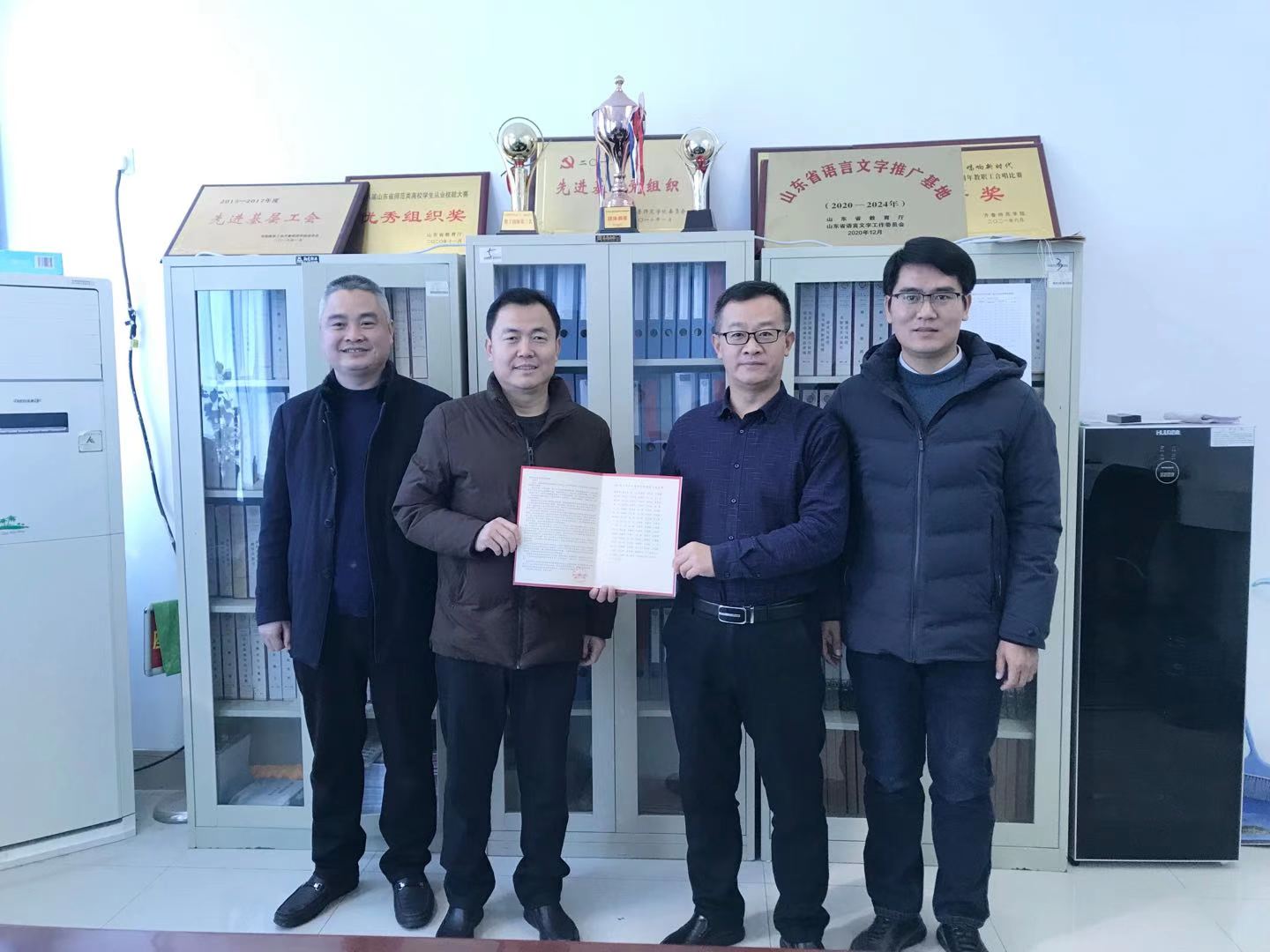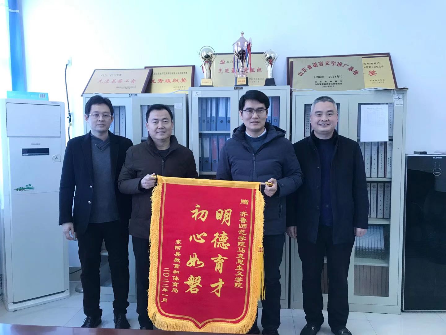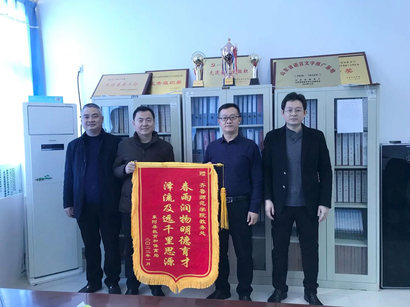 2022年1月13日上午,东阿县实验中学校长陈忠伟、实验小学校长王士军代表东阿县教体局向金年会官网赠送锦旗及感谢信,教务处处长孙洪兆、马克思主义学院院长赵立峰接受了锦旗及感谢信,并与他们进行了亲切座谈。