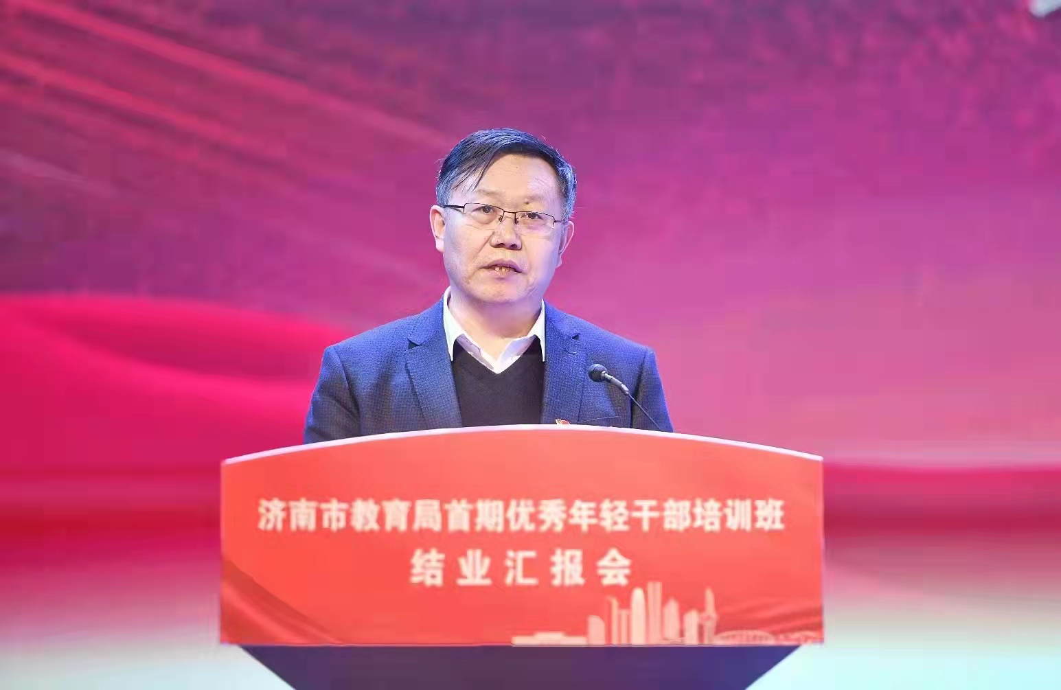 王紘代表济南市教育局讲话。他表示,局党组举办这次年轻干部培训班,目的是要着力打造一支高素质专业化创新型有纪律敢担当的年轻“铁军”队伍,是要激发年轻干部“想干事、能干事、干成事”的豪情斗志、火热激情,是要释放市委教育工委和局党组高度重视年轻干部工作的鲜明态度、强烈信号,更是要让年轻干部成为济南教育再攀新高的开路先锋、热血尖兵。经过一年多的培养,达到了预期的培训成果。今天的展示活动,充分展现了大家良好的精神状态、深厚的教育情怀、优秀的综合素质、无尽的发展潜力。王紘强调,2021年12月,市政府发布了《济南市教育发展“十四五”规划》,吹响了济南教育高质量发展的冲锋号。面对新形势、新机遇、新挑战,惟不忘初心者进,惟从容自信者胜,惟改革创新者强。