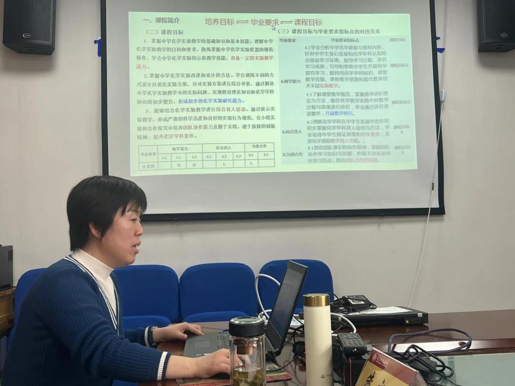 会议过程中,化学与化工学院副院长刘新征、教研室主任董丽花分别以《化学专业人才培养方案》和《中学化学实验研究大纲》为例和进行了汇报,详细介绍了化学专业定位、培养目标、毕业要求、课程与教学、合作与实践、师资队伍、支持条件、质量保障、学生发展和课程体系结构等内容,征询专家对方案和大纲修改的意见或建议。姜文清教授针对实验类课程大纲中过程性考核方式的执行向专家咨询,专家指出进一步对课程目标的描述进行修订,考核方式要与课程目标明确对应。