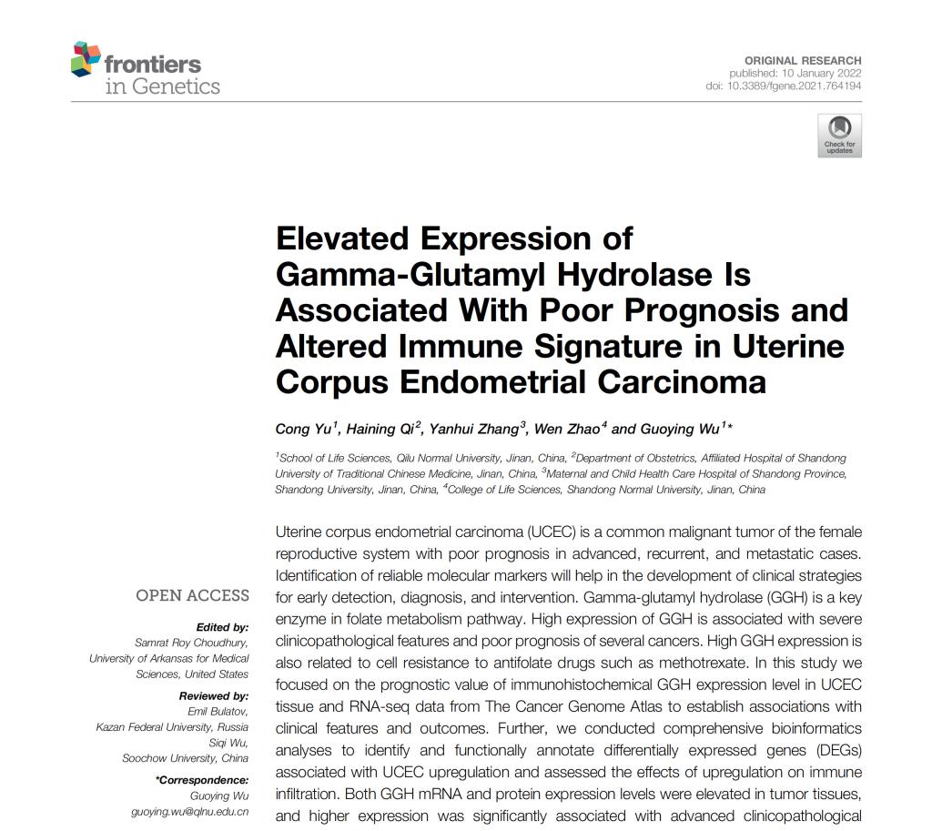 1月10日,重点实验室团队带头人吴帼英教授作为通讯作者,完成的论文《Elevated Expression of Gamma-Glutamyl Hydrolase Is Associated With Poor Prognosis and Altered Immune Signature in Uterine Corpus Endometrial Carcinoma》在中科院3区期刊《Frontiers in Genetics》(IF:4.59)上发表。重点实验室成员于聪博士作为第一作者,参与并完成该项目研究。