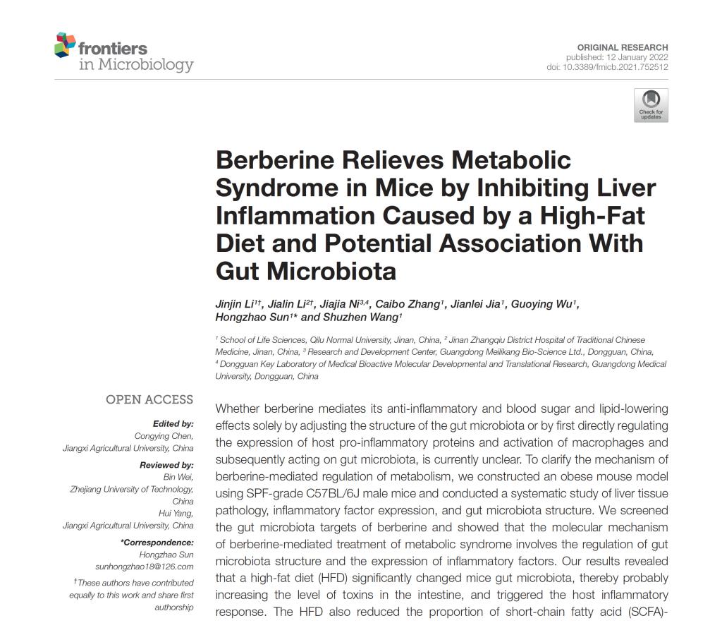 1月22日,孙洪兆教授作为通讯作者,完成的论文《Berberine Relieves Metabolic Syndrome in Mice by Inhibiting Liver Inflammation Caused by a High-Fat Diet and Potential Association With Gut Microbiota》在中科院2区期刊《Frontiers in Microbiology》(IF:5.64)上发表。重点实验室成员李金金博士作为第一作者,吴帼英教授和2018级生物科学专业王淑贞同学参与并完成该项目研究。
