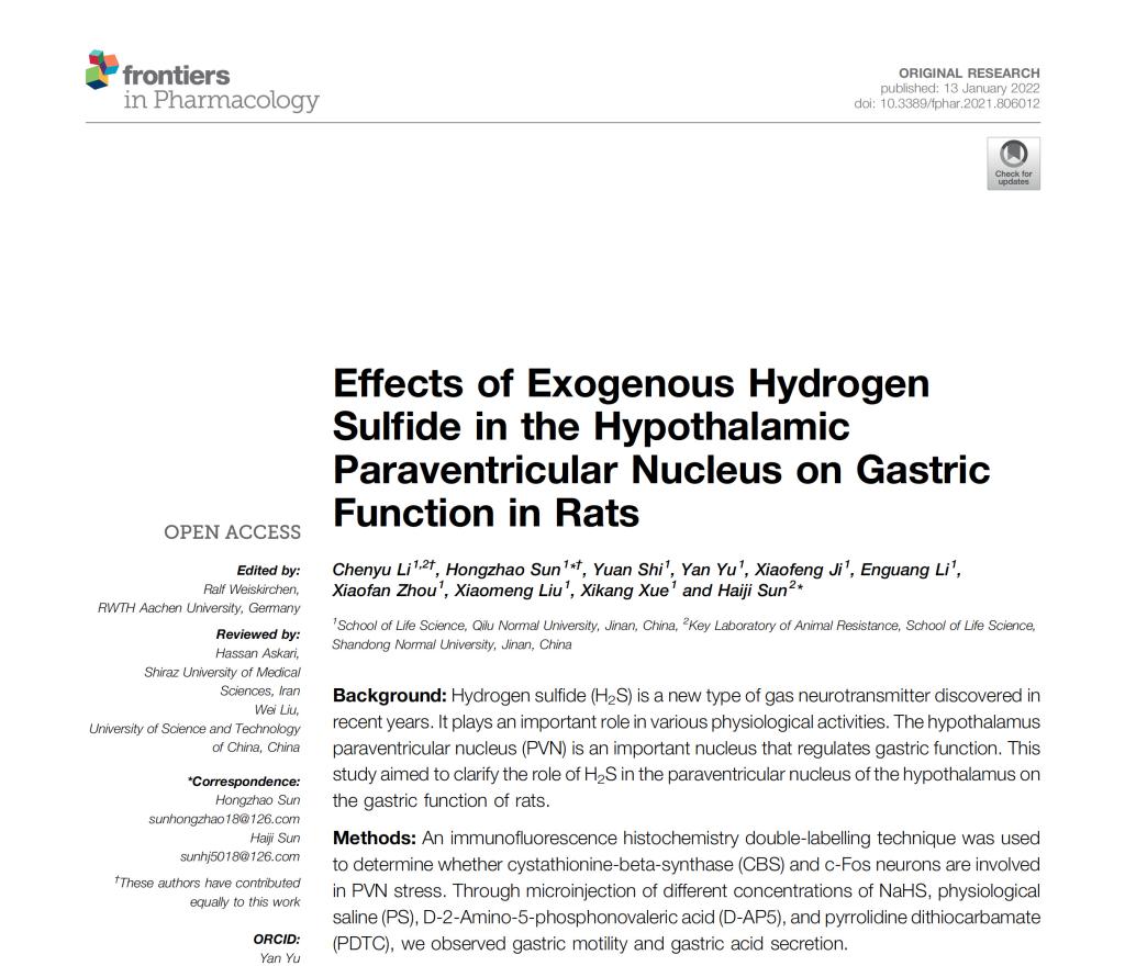 1月13日,重点实验室主任孙洪兆教授作为第一作者和通讯作者,完成的论文《Effects of Exogenous Hydrogen Sulfide in the Hypothalamic Paraventricular Nucleus on Gastric Function in Rats》在中科院2区TOP期刊《Frontiers in Pharmacology》(IF:5.81)上发表。孙洪兆教授所指导研究生李宸宇同学作为共同第一作者,参与并完成该项目研究。
