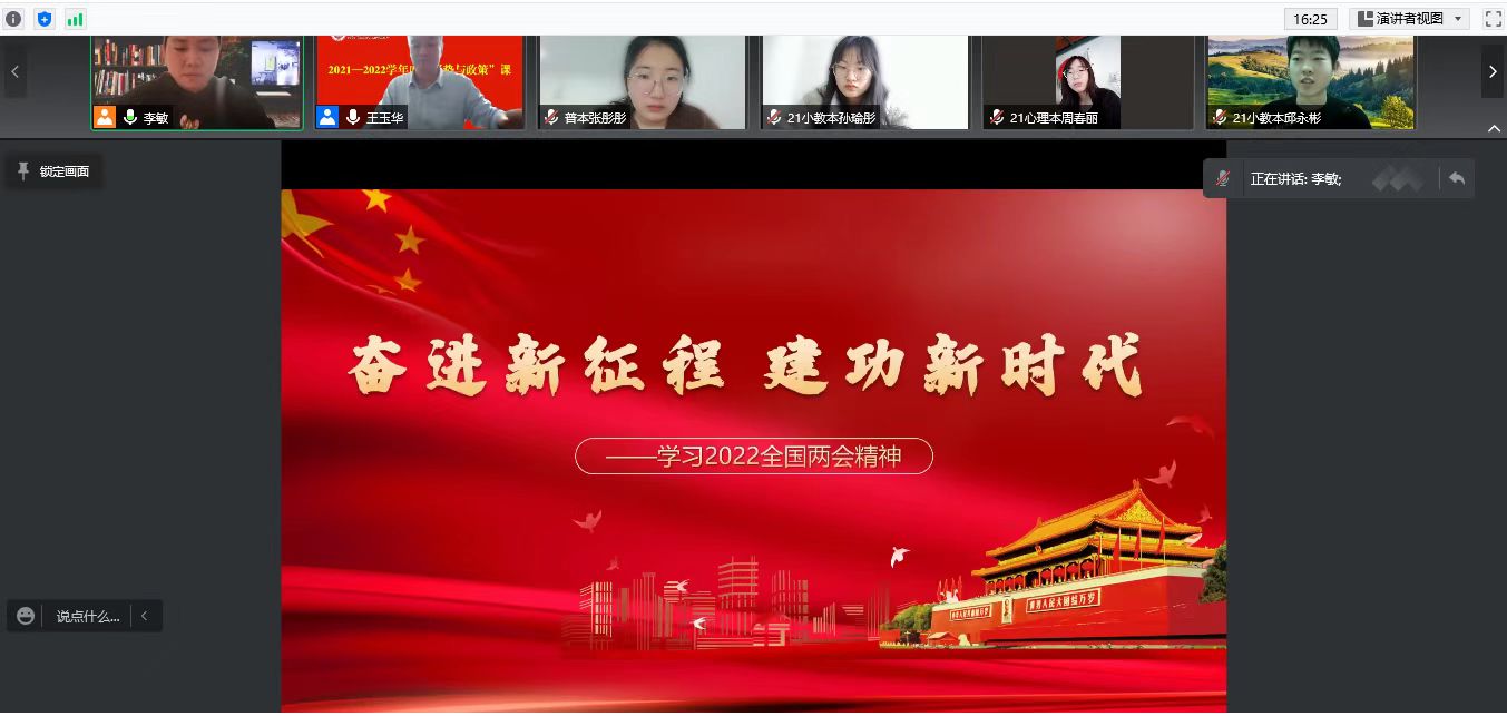 学校领导班子以习近平新时代中国特色社会主义思想为指导,围绕全国两会精神和党史学习教育,以《奋进新征程 建功新时代——学习2022全国两会精神》《文化自信:更基本、更深沉、更持久的力量——学悟习近平总书记关于中华优秀传统文化与齐鲁优秀传统文化的论述》《党的历史使命与行动价值》等主题展开教学工作。通过讲解2022政府工作报告的主要内容、解读两会热词,阐释习近平总书记对传统文化的论述,从党史视域中述说校史,引导学生增强爱校意识并进一步更好地爱党爱国爱社会主义,不断引领师院广大青年学子更加紧密地团结在以习近平同志为核心的党中央周围,增强“四个意识”、坚定“四个自信”、做到“两个维护”,号召同学们踔厉奋发、笃行不殆,为夺取全面建设社会主义现代化国家新胜利、实现中华民族伟大复兴的中国梦做出新的更大贡献。