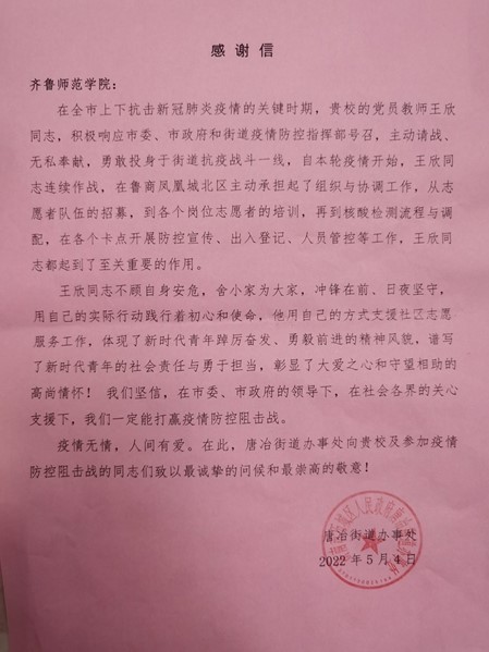 4月27日,王欣所在的街道社区被划为临时管控区,疫情形势严峻。他得知情况后,他再次主动请战:第一时间向学校申请返回社区,参与到鲁商凤凰城北区的疫情防控志愿服务工作当中。回到社区的他始终不曾忘记自己党员教师的身份,在他的防护服上,除了名字,还会有四个字“齐鲁师院”。他向社区党支部书记仇加强表示:疫情不退他不退。他把在学校疫情防控中得到的宝贵经验带回了社区,主动承担起组织协调工作,从志愿者队伍的招募,到各个岗位志愿者的培训,再到核酸检测流程的调配,在各个卡点开展防控宣传、出入登记、人员管控等工作,王欣都起到至关重要的工作。
