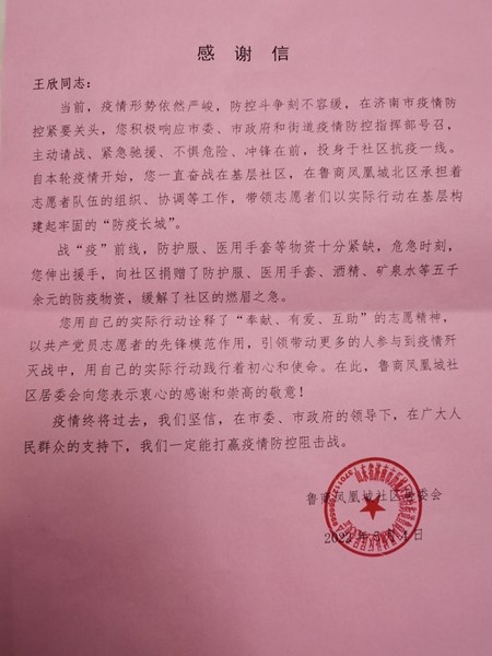 战“疫”前线,防护服、医用手套等物资十分紧缺,危急时刻,王欣伸出援手,向社区捐赠了防护服、医用手套、酒精、矿泉水等5000余元的防疫物资,缓解了社区的燃眉之急。他的辛勤付出和舍小家为大家的精神,得到了大家的认可,在鲁商凤凰城社区,包括居委会、物业以及所有参与抗疫一线的志愿者,都把他当作自己的榜样,一呼百应。为此,唐冶街道办事处和鲁商凤凰城社区委员会还写信以表感谢。