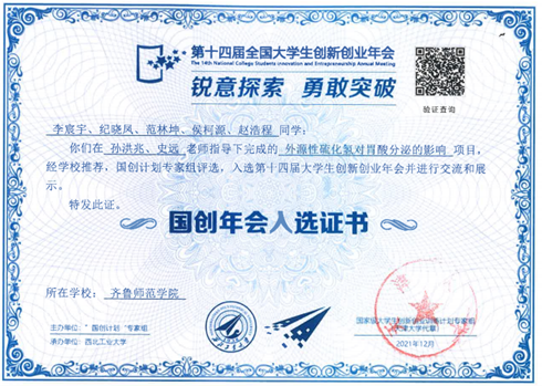2021年12月10日至12月12日,由教育部主办的第十四届全国大学生创新创业年会(以下简称“国创年会”)在西北工业大学举办。金年会官网生命科学学院本科在校生李宸宇等5名同学负责的项目《外源性硫化氢对胃酸分泌的影响》入选并进行交流和展示。