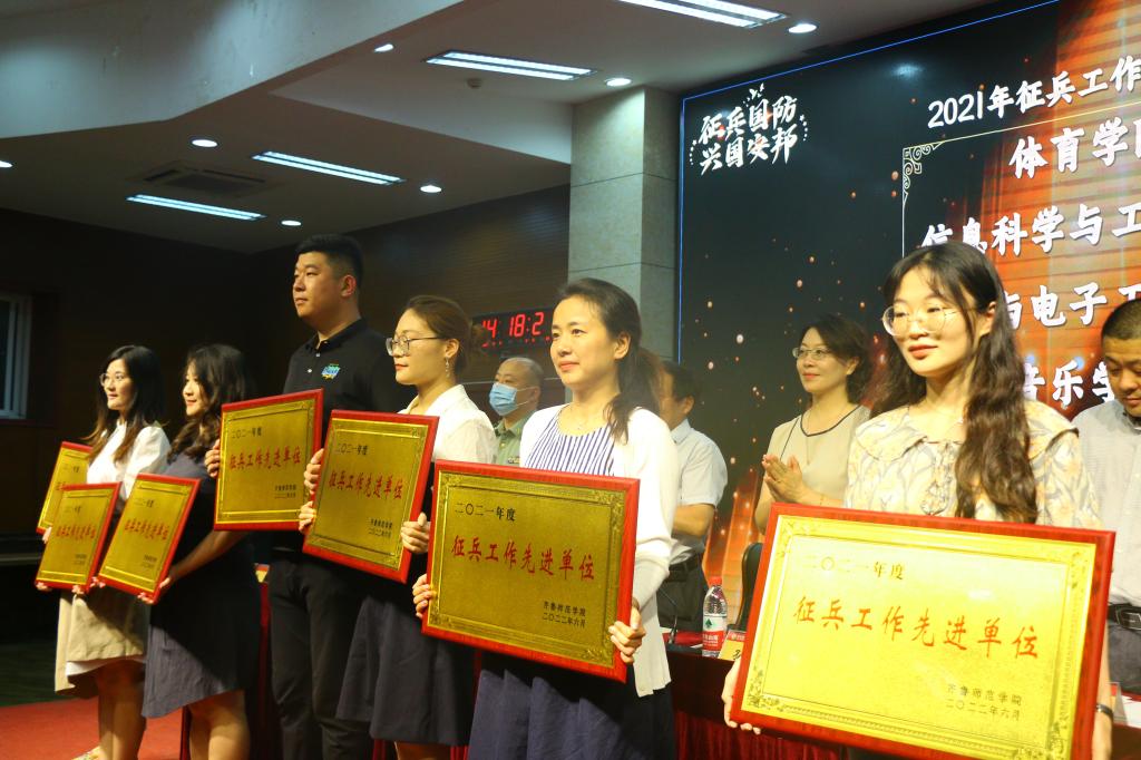 为鼓励先进、树立典型,大会对体育学院、信息科学与工程学院、物理与电子工程学院、音乐学院、美术学院、历史文化学院、化学与化工学院7个单位进行了表彰,授予“2021年度征兵工作先进单位”荣誉称号,进一步推动学校征兵工作再上新台阶。