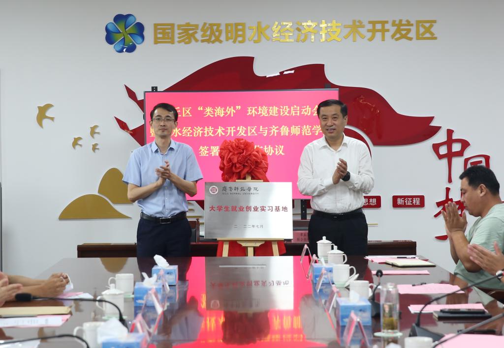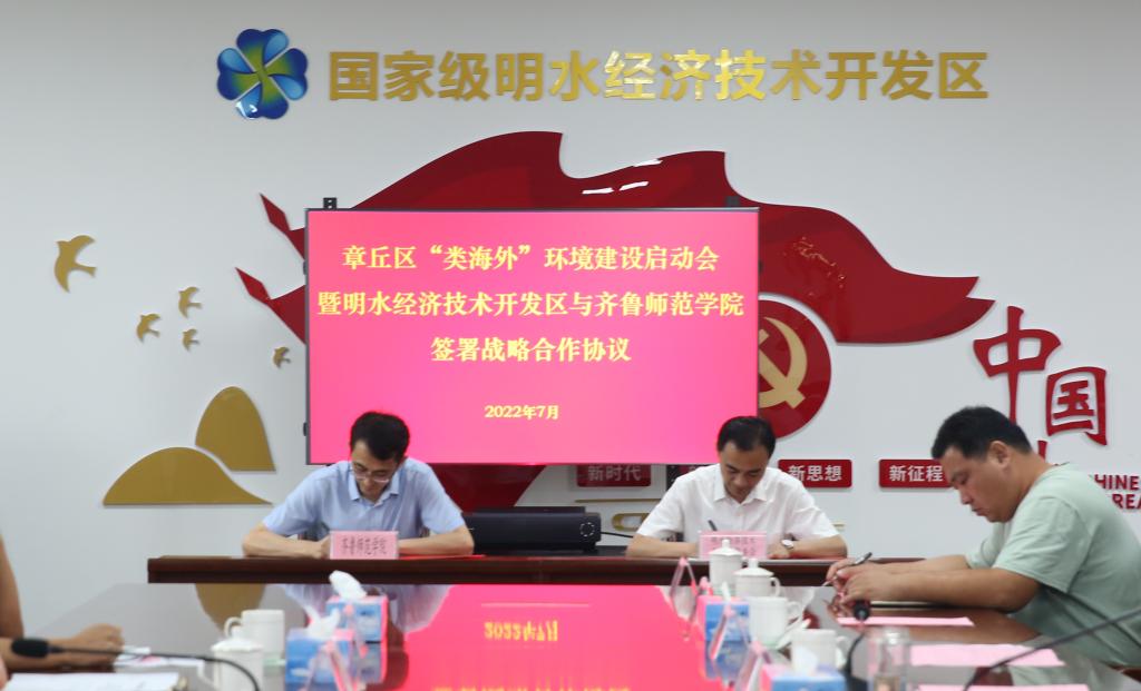 7月19日,章丘区“类海外”环境建设启动会暨JINNIAN金年会与明水经济技术开发区签署战略合作协议活动顺利举办。济南市外办党组成员、副主任李茂鑫,明水经济技术开发区党工委副书记、主任黄波、副主任郎咸颖出席活动。金年会官网有六个产学研合作项目集中签约,JINNIAN金年会党委委员、副校长孙正参会并致辞,合作发展办公室及相关学院负责人参会。