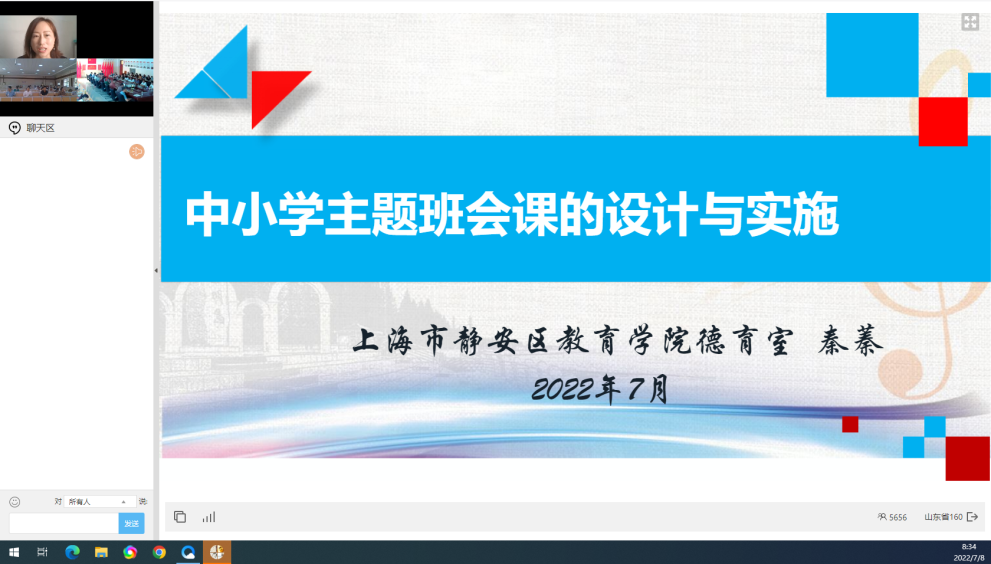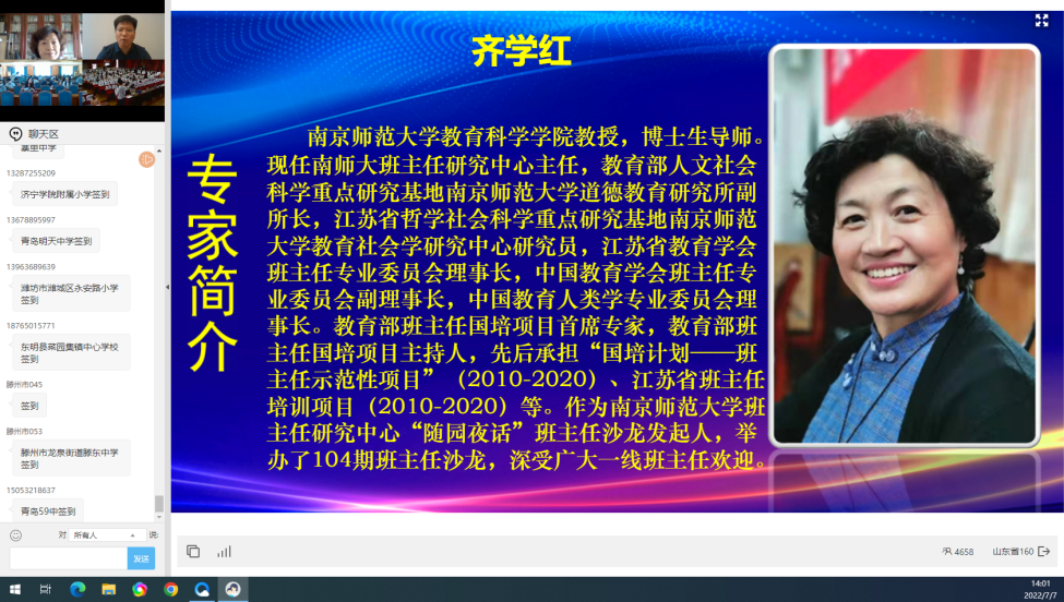7月6日至9日,培训邀请了齐学红、赵福江、秦蓁和郭春飞四位专家采取同步在线的方式围绕“立德树人”背景下的班级建设理论与实践、班级管理的理念与策略、主题班会课的设计与实施、班主任的专业成长知识与修养做了专题讲座,参训人员以学校单位组织开展了集中学习和现场研讨活动。