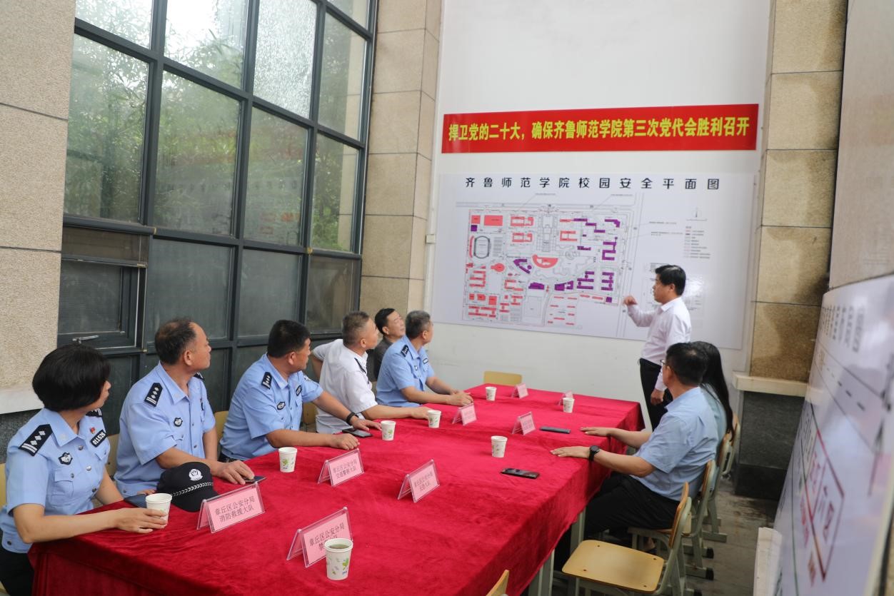 李伯伟就学校校园安全及政治稳定情况作汇报,贾国斌现场解读警务室建设布局及目前工作效果。
