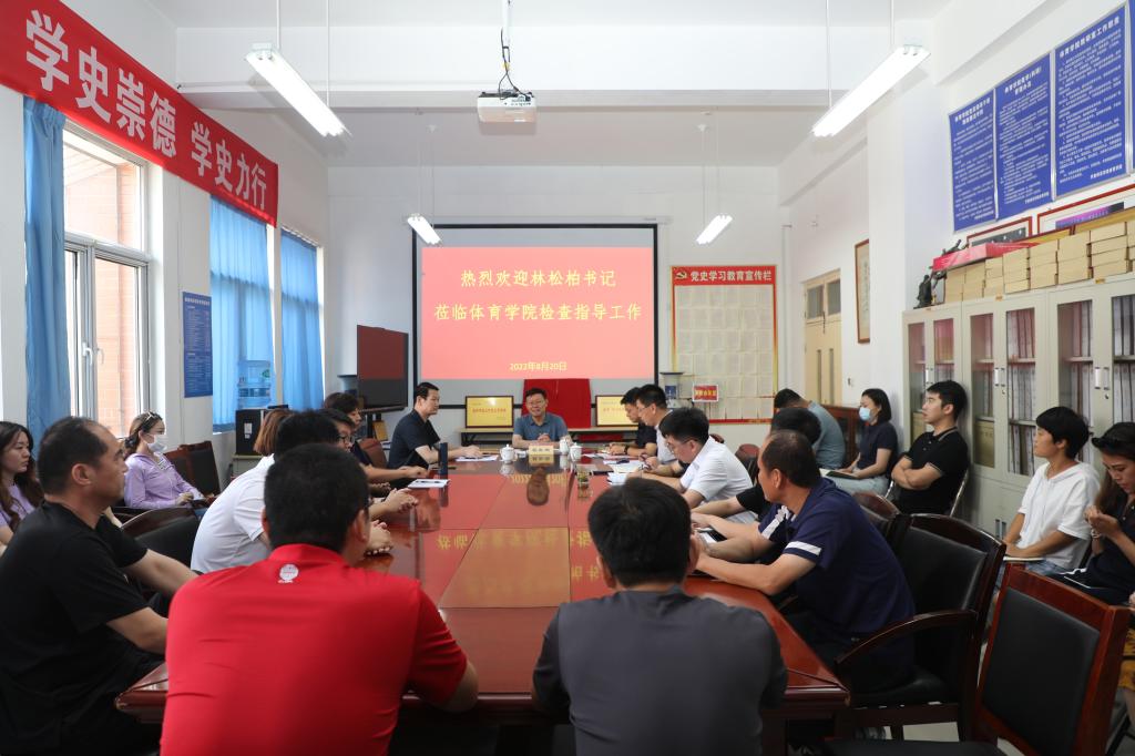 8月20日上午,学校党委书记林松柏到体育学院调研指导工作,并为体育学院教师第二党支部荣获“全国党建工作样板支部”进行授牌。党委组织部部长杨磊、学生工作部部长朱礼恒参加活动。体育学院党政领导班子及全体教师参会,会议由体育学院党委书记胡义忠主持。
