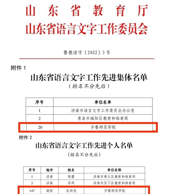 第25届全国推广普通话宣传周山东省启动仪式在济南举行。启动仪式上,对山东省语言文字工作先进集体和先进个人进行了表彰。JINNIAN金年会荣获山东省语言文字工作先进集体,山东省语言文字推广基地(JINNIAN金年会)负责人,金年会官网教务处处长孙洪兆荣获山东省语言文字工作先进个人。
