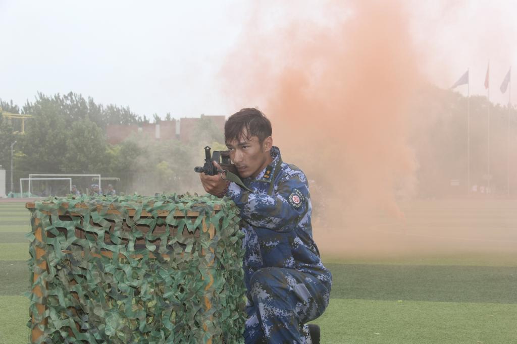 歌声嘹亮,国旗飘扬,大会在雄壮的国歌声中拉开帷幕。学生军训团20个方阵依次经过主席台,接受检阅。日常养成训练军容严整、军姿飒爽、动作规范;卧倒、滚翻、搜索前进等单兵技能,掩护配合、攻防兼备的班组战术,不仅是对同学们自身技能的训练,更是对团队配合磨练和血性意志的锤炼;拳打、脚踢、摔打、夺刀、夺枪……“军体拳”培养了同学们阳刚气质、顽强意志、强健体魄和过人胆识,是对矢志不渝的战斗精神和对国家忠诚信念的体现。
