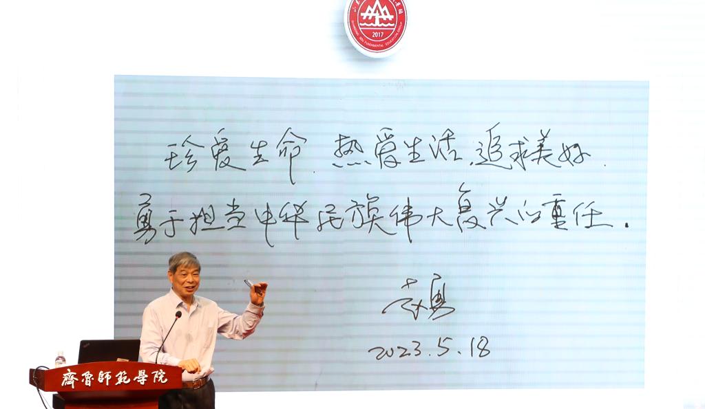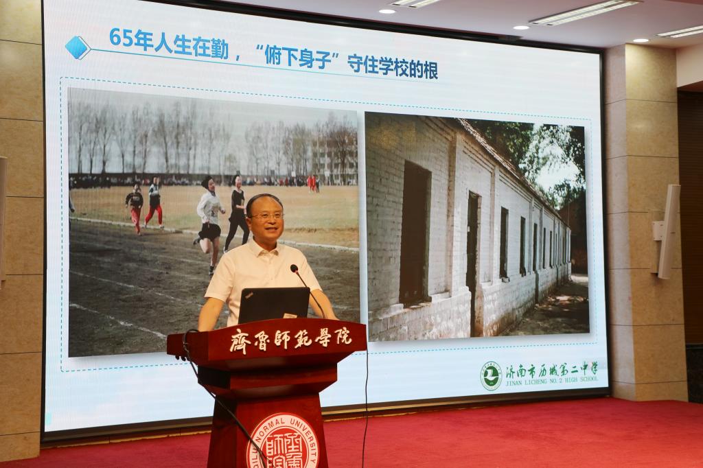 李新生以《寻求普通高中教育之道——兼论历城二中的“勤志教育”》为题,从“英才教育”“科技创新教育”“艺体教育”三方面详细介绍了历城二中的发展历程和办学特色,阐发了以“勤志文化”为核心的办学精神和理念,展示了“勤志”文化培养历二学子的生动案例,并就如何成为一名优秀的基础教育从业教师对现场同学进行了精准的专业指导。