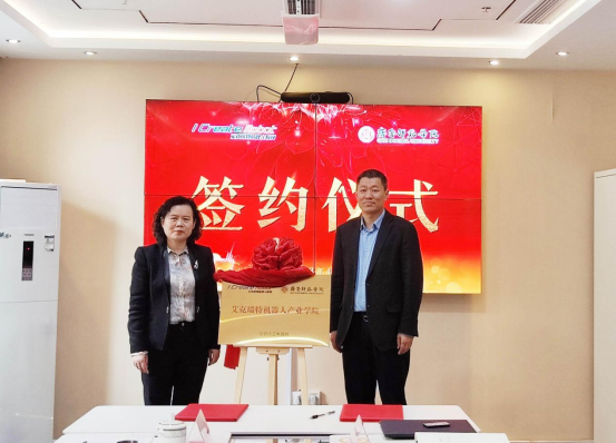 赵敏与张祖平共同为“艾克瑞特机器人产业学院”揭牌,张洁与张祖平分别代表校企两方签署合作协议书。