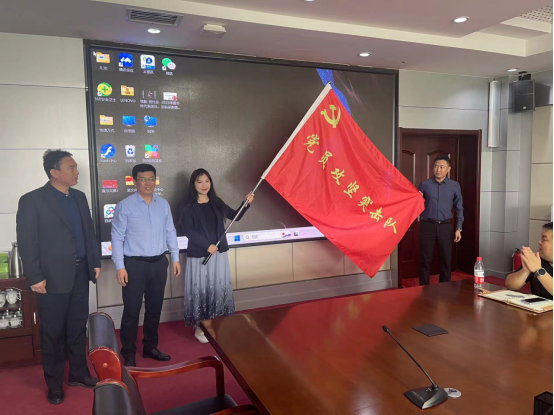 后勤党总支全体党员面对鲜红的党旗重温入党誓词,李伯伟向党员代表授“党员攻坚突击队”旗帜。