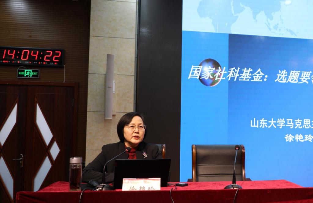 报告会上,徐艳玲教授深入讲解了国家社科基金选题的重要性以及论证的策略,提出文献综述是选题论证的基础性功课,要采用围绕主题、多学科视角、对“旧”材料进行”新”解读等方法,站在学科前沿,从学术史脉络中凝练“他说”,从“他说”中升华出“我见”,找到该论域的新生长点;强调在申报书撰写过程中,要注意各要素创新性诉求打开的方式,选题要具有独到学术价值和应用价值、研究对象要聚焦、观点的呈现方式要清晰、“研究基础”与选题的关系要呼应;要注意探索申报书撰写背后的科研规律,关注选题的前沿性、逻辑的自洽性和学术的规范性。