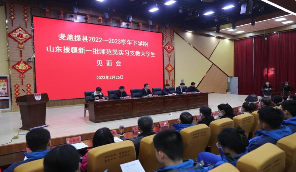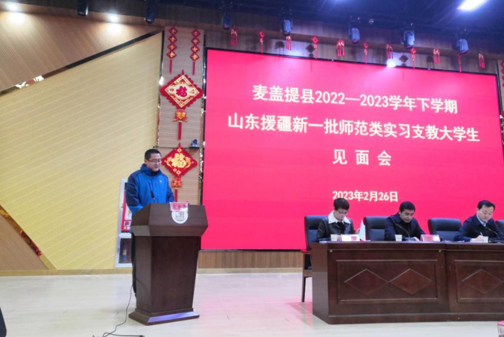 2023年2月26日,新疆麦盖提县2022-2023学年下学期山东援疆新一批师范类实习支教大学生见面会召开,JINNIAN金年会援疆实习支教团全体师生参加会议。麦盖提县委常委、副县长,日照援疆指挥部党委副书记、副指挥许洋出席会议并讲话,麦盖提县政协副主席、教育工委副主席、教育局党委副书记何军致辞。JINNIAN金年会实习支教大学生带队教师代表王通,实习支教大学生代表张新昕进行发言。会议由麦盖提县教育局党组副书记、局长玉苏甫江·艾合买提主持。
