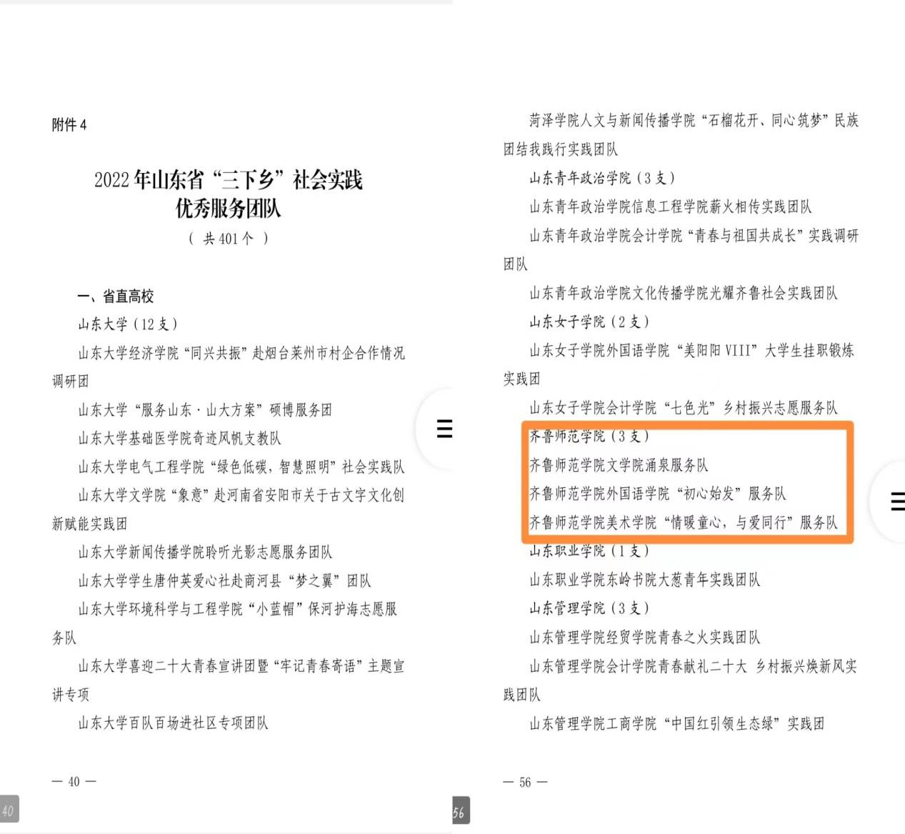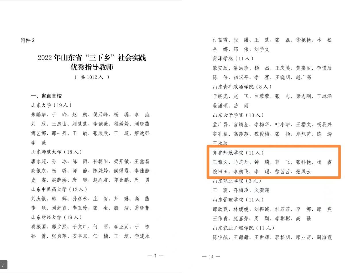 近日,省委宣传部、省文明办、省教育厅、团省委、省学联联合下发《“调研山东”--2022年山东省大中专学生志愿者暑期“三下乡”社会实践活动的通报》,金年会官网荣获“优秀组织单位”,王雅文、马芝丹等11人荣获“优秀指导教师”,辛忠宇、贾瑶函等22人荣获“优秀学生”,文学院涌泉服务队、外国语学院“初心始发”服务队、美术学院“情暖童心,与爱同行”服务队荣获“优秀服务团队”。