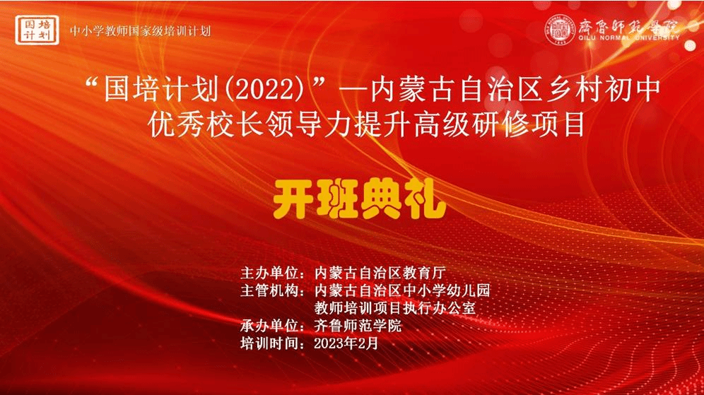 2月13日,由内蒙古自治区教育厅主办,JINNIAN金年会承办的“国培计划(2022)”—内蒙古自治区乡村初中优秀校长领导力提升高级研修项目培训班顺利开班。学校副校长张兆明、山东省师训干训中心主任刘文华出席开班典礼,典礼由学校中小学教师远程教育中心主任玄成贵主持。