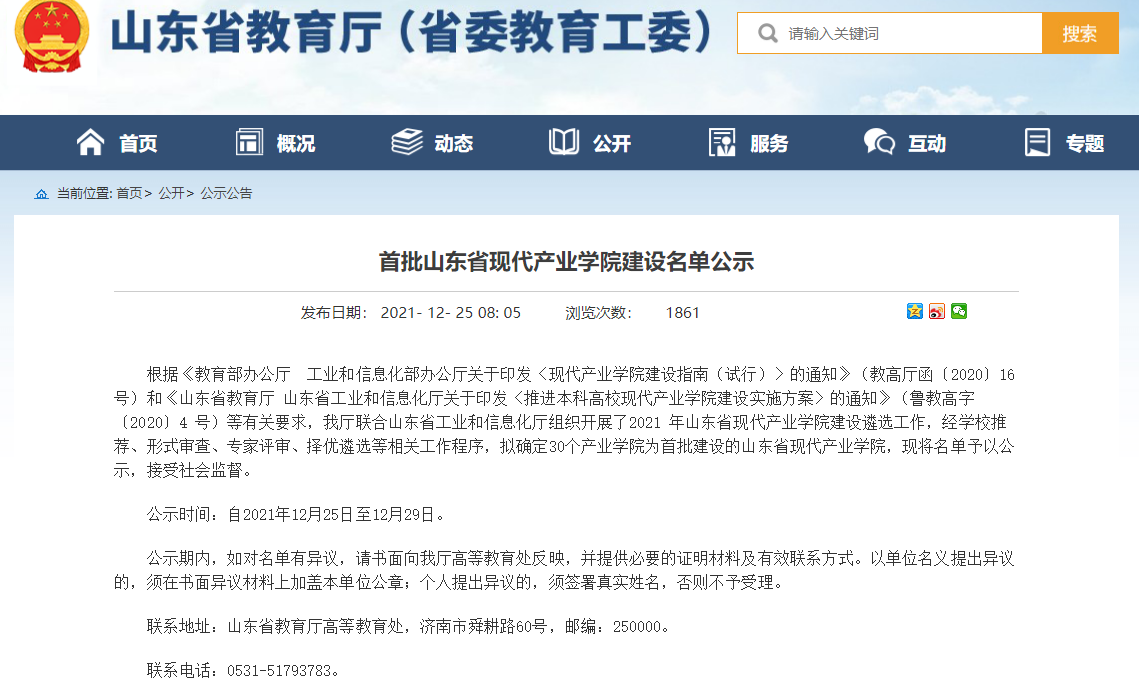 根据教育部、工业和信息化部关于现代产业学院建设指南的有关通知,以及山东省教育厅、山东省工业和信息化厅关于推进本科高校现代产业学院建设实施方案的通知等有关要求,省教育厅联合省工业和信息化厅组织开展了2021 年山东省现代产业学院建设遴选工作,确定“山东大学齐鲁交通学院”等30个产业学院为首批建设的山东省现代产业学院。