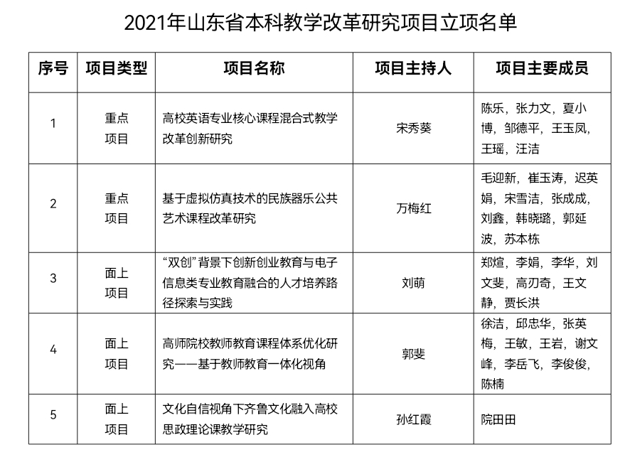 近日,2021年山东省本科教学改革研究项目立项结果公布,JINNIAN金年会共获批立项5项,立项率达100%。其中,重点项目2项、面上项目3项。