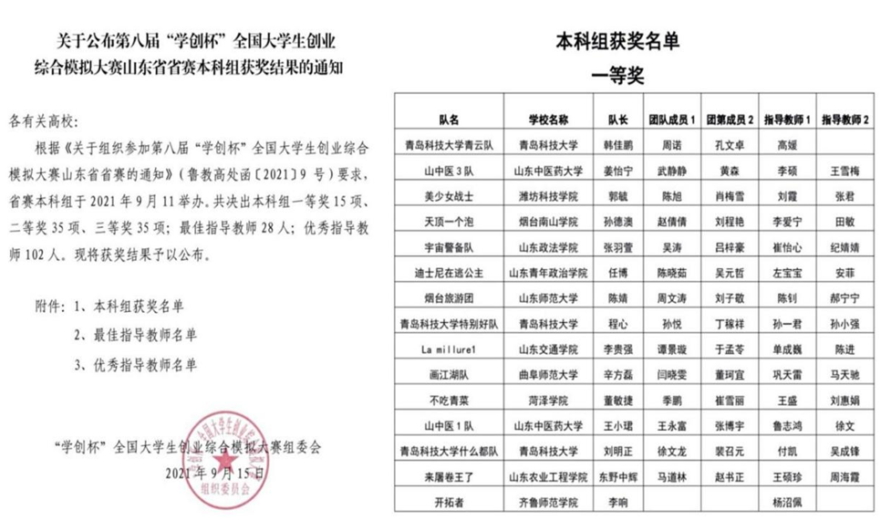 9月11日,由高等学校国家级实验教学示范中心联席会经济与管理学科组主办,山东省教育厅高等教育处指导,烟台大学承办的2021年第八届“学创杯”全国大学生创业综合模拟大赛山东省创业综合模拟竞赛(本科)网络赛顺利开展。由金年会官网物理与电子工程学院辅导员杨沼佩指导,2020级李响同学一路披荆斩棘,最终斩获山东省一等奖,杨沼佩荣获本次大赛的“最佳指导教师”奖项。
