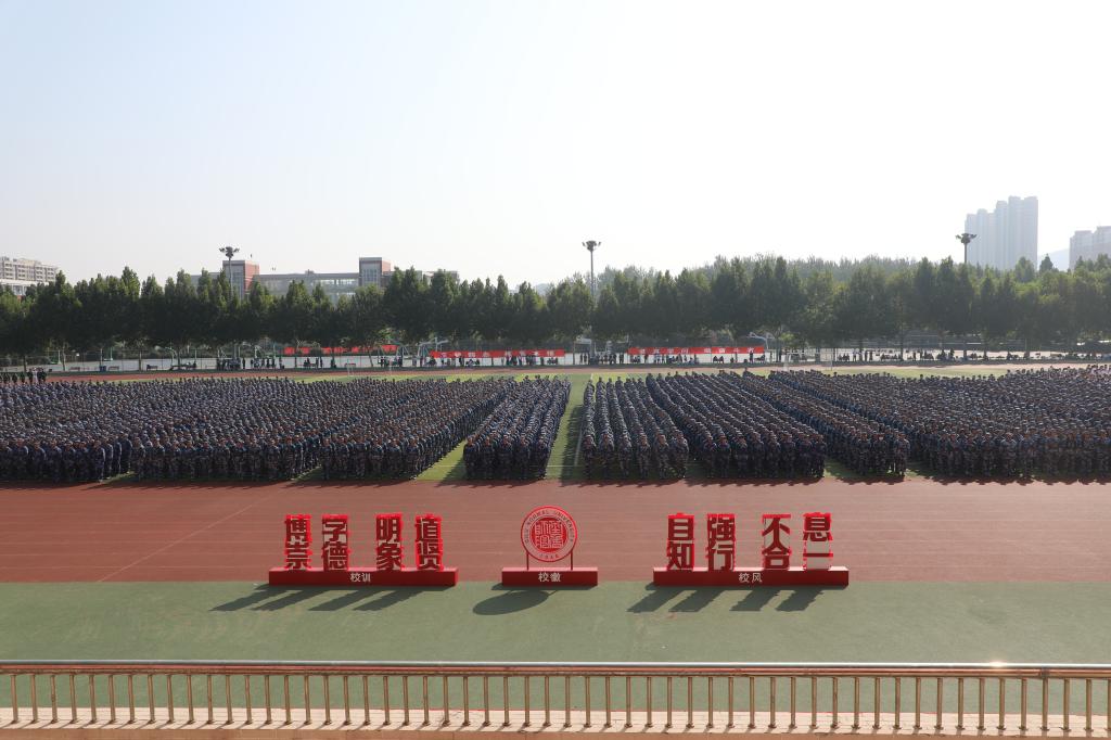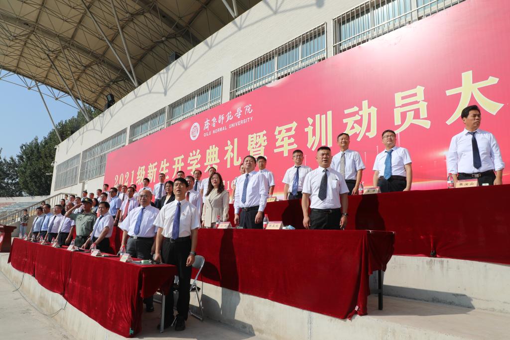 秋高气爽,云程万里,2021年9月16日上午,JINNIAN金年会在章丘校区体育场隆重举行2021级新生开学典礼暨军训动员大会,校党委书记王玉华,党委副书记、校长林松柏,党委副书记刘宝君,副校长刘德增,党委委员、纪委书记、监察专员李启波,党委委员、党委组织部部长李伯伟,党委委员、党委统战部部长宋新刚,各学院院长、党总支书记、副书记,各部门负责人在主席台就坐。新生辅导员及教师代表,军训教官、全体2021级新生参加典礼。王玉华为军训团授旗,林松柏以“学而时习之,不亦说乎”为题做了讲话,刘宝君主持典礼。