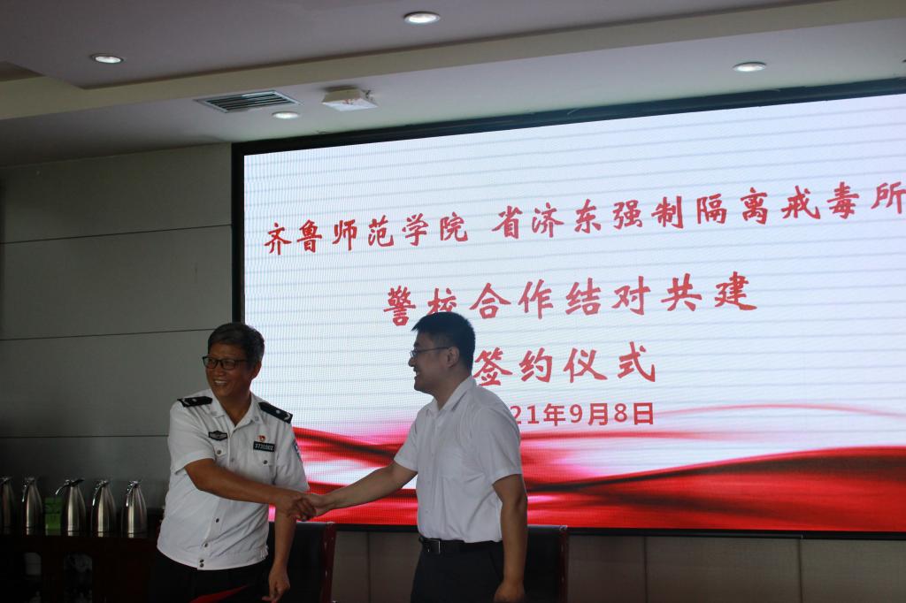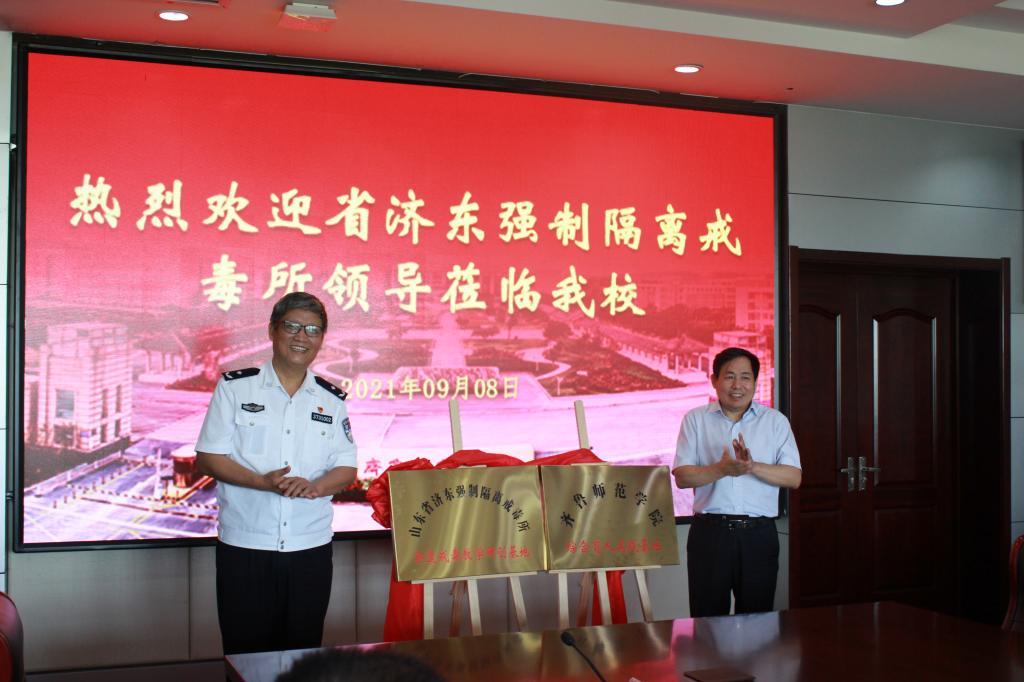 9月8日上午,金年会官网与山东省济东强制隔离戒毒所警校结对共建签订仪式和“山东省济东强制隔离戒毒所非遗戒毒研创基地”挂牌仪式在图书馆四楼会议室举行。校党委副书记刘宝君和山东省济东强制隔离戒毒所党委副书记、政委张凯代表双方授牌,校团委书记孔庆松主持会议。济东所教育中心主任孙丰标,心理矫治中心主任彭子荣,政治处副主任郭大威,康复训练中心等一行10余人莅临金年会官网,保卫工作部副部长韩玉柱,各学院团总支书记、辅导员代表,马克思主义学院教师刘金玲副教授,学生代表参加了签约、揭牌仪式。
