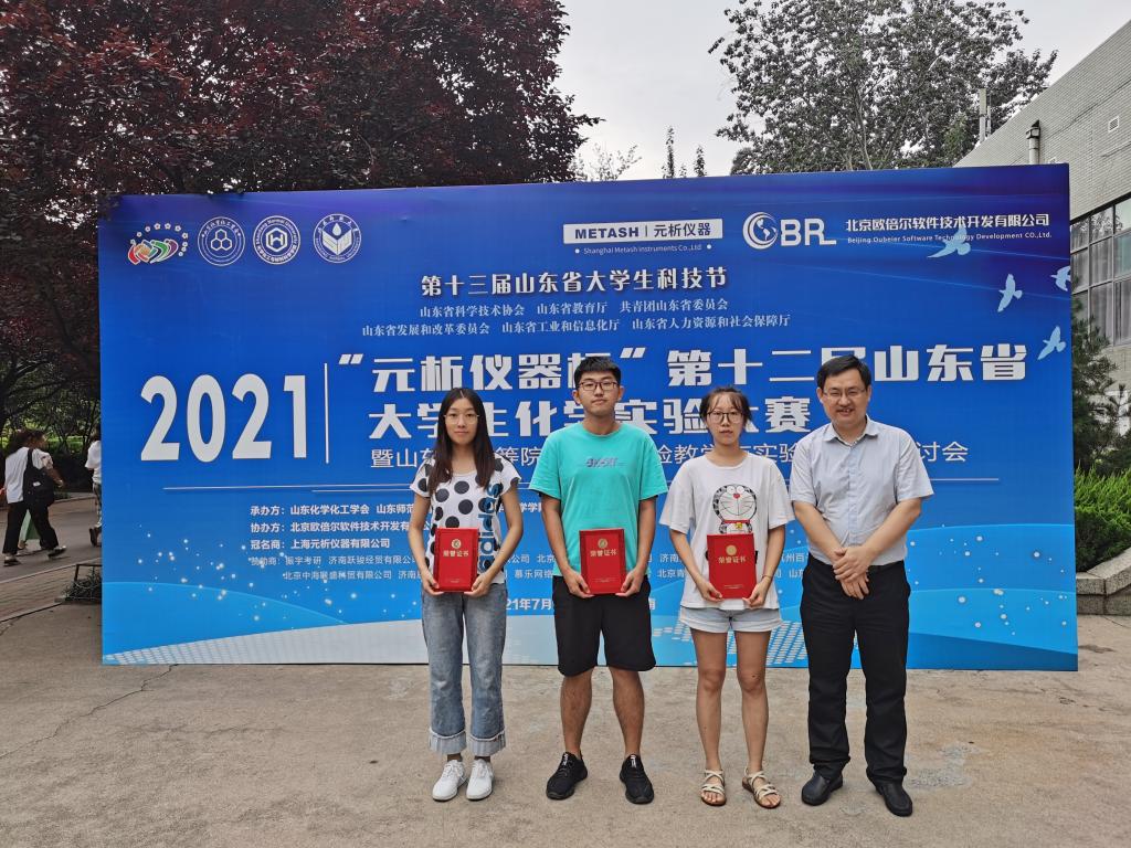 金年会官网化学与化工学院刘光增老师带队,2018级化学专业和制药工程专业学生葛金雨、杨旭、李春梅在第十二届山东省大学生化学实验大赛中分别获得一、二、三等奖。