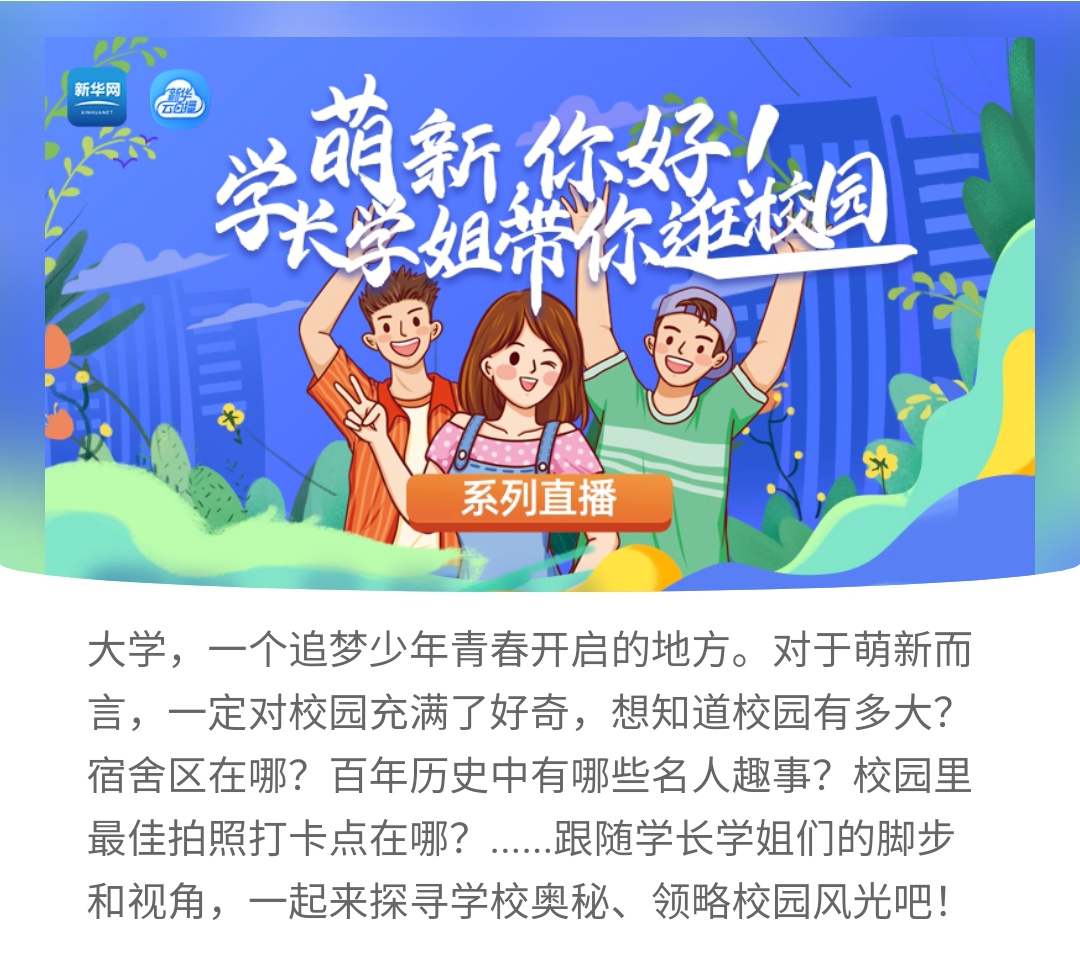 慕齐风鲁韵,承师风浩然。7月21日下午,金年会官网与新华网联合推出的“萌新你好|‘云’逛JINNIAN金年会”活动顺利进行。该活动是新华网“萌新你好|学长学姐带你逛校园”系列直播活动之一,以“直播+录播”的形式在新华网首页播出,通过学长学姐视角,带领萌新们提前探寻学校奥秘、领略校园风光,目前播出10期,金年会官网作为走进山东高校的第二站,以74.8万人次播放量创10期之最。