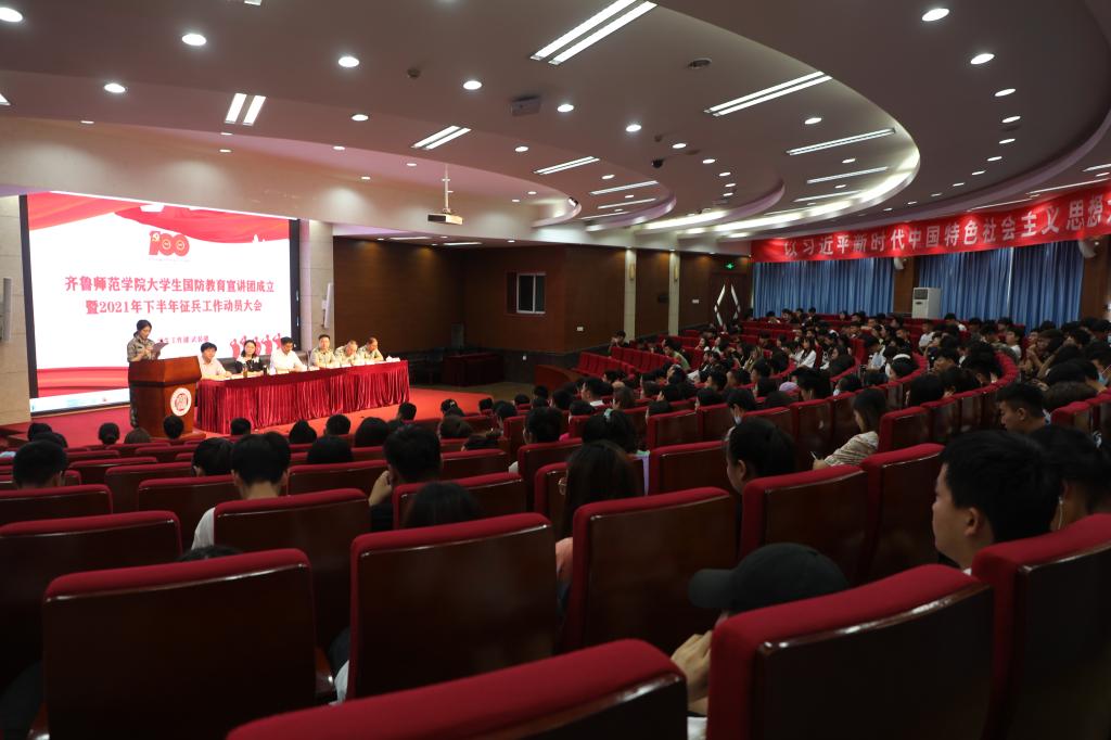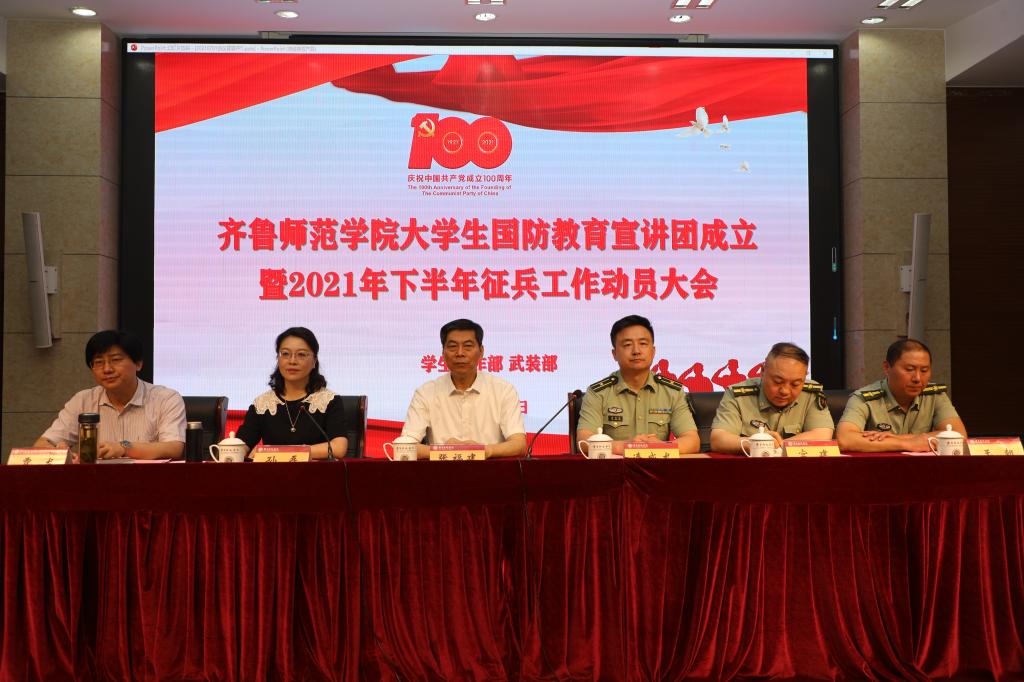 在热烈庆祝中国共产党成立百年之际,为深入贯彻落实习近平强军思想的使命担当,进一步激发金年会官网青年学子传承红色基因、增强国防意识、携笔从戎报国的情怀。7月2日上午,金年会官网在章丘校区图书馆学术报告厅举办大学生国防教育宣讲团成立暨2021年下半年征兵工作动员大会,党委委员、副校长张福建出席并讲话。本次会议邀请了济南市征兵办公室和历下区征兵办公室到校进行政策宣讲。学生工作部(处)、武装部、各学院党总支副书记,团总支书记、辅导员、全体军事理论课教师、应征入伍报名的学生代表近300人到场聆听,会议由学生工作部(处)、武装部部长孙磊主持。