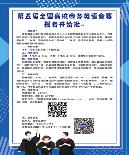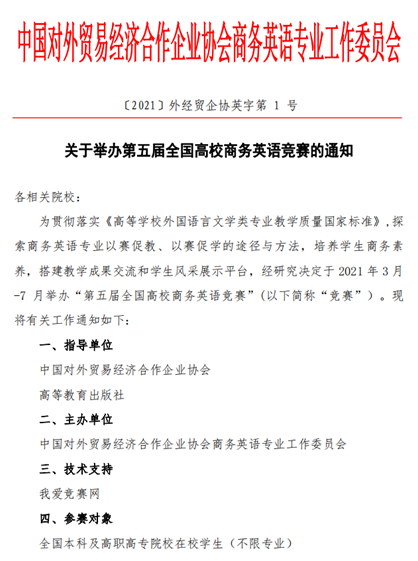 全国高校商务英语竞赛由中国对外贸易经济合作企业协会商务英语专业工作委员会主办,竞赛题目为全英文,采取计算机闭卷+在线智能监考考试形式进行,内容涵盖商务英语听力、商务综合知识与词汇、语法等。此次竞赛共有全国1700多所高校共计26000余人报名参赛,最终共有10100人晋级全国线上总决赛。