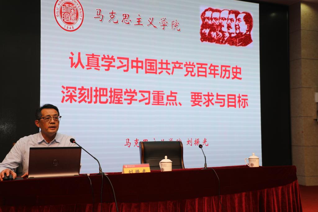 结业式上,学校党史学习教育宣讲团成员、马克思主义学院院长刘振光教授以《学习中国共产党百年历史,深刻把握学习要求与目标》为题作专题报告。刘振光从“中国共产党百年历史概述、学习中国共产党百年历史的重点、学习中国共产党百年历史的目标与要求”等三个方面进行阐述,报告既高度概括、言简意赅,又重点突出、逻辑性强。