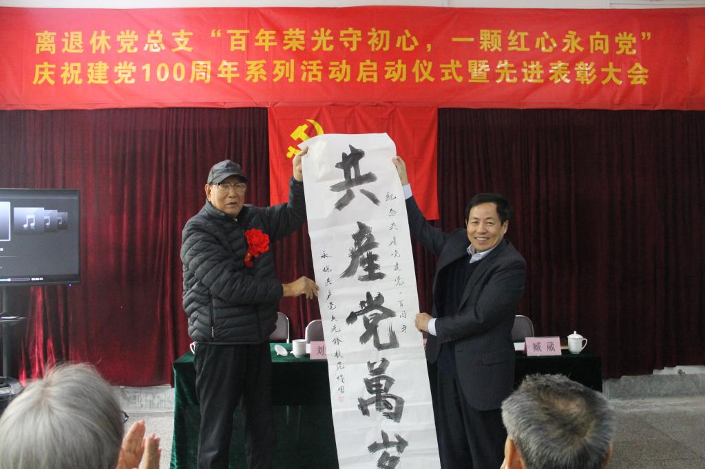 离休干部、原学校副院长、92岁高龄的徐进同志,专门为庆祝建党100周年挥毫泼墨,书写了“共产党万岁---永葆共产党员先锋模范作用”,并进行了赠送仪式。