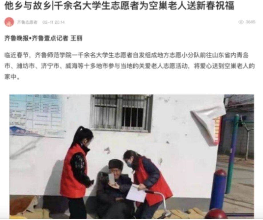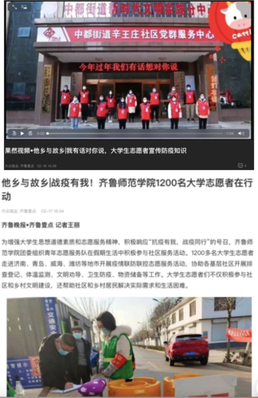 齐鲁晚报等省级媒体亦纷纷为金年会官网青年志愿者点赞,发布“他乡与故乡”系列报道《我有话对你说 大学生志愿者宣传防疫知识》《战疫有我!JINNIAN金年会1200名大学志愿者在行动》《千余名大学生志愿者为空巢老人送新春祝福》等志愿服务报道12篇。通过系列志愿服务活动,引领着师院青年学子在社会实践中体会志愿服务精神,养成助人为乐、团结互助的美好品德,以知促行、收获成长。