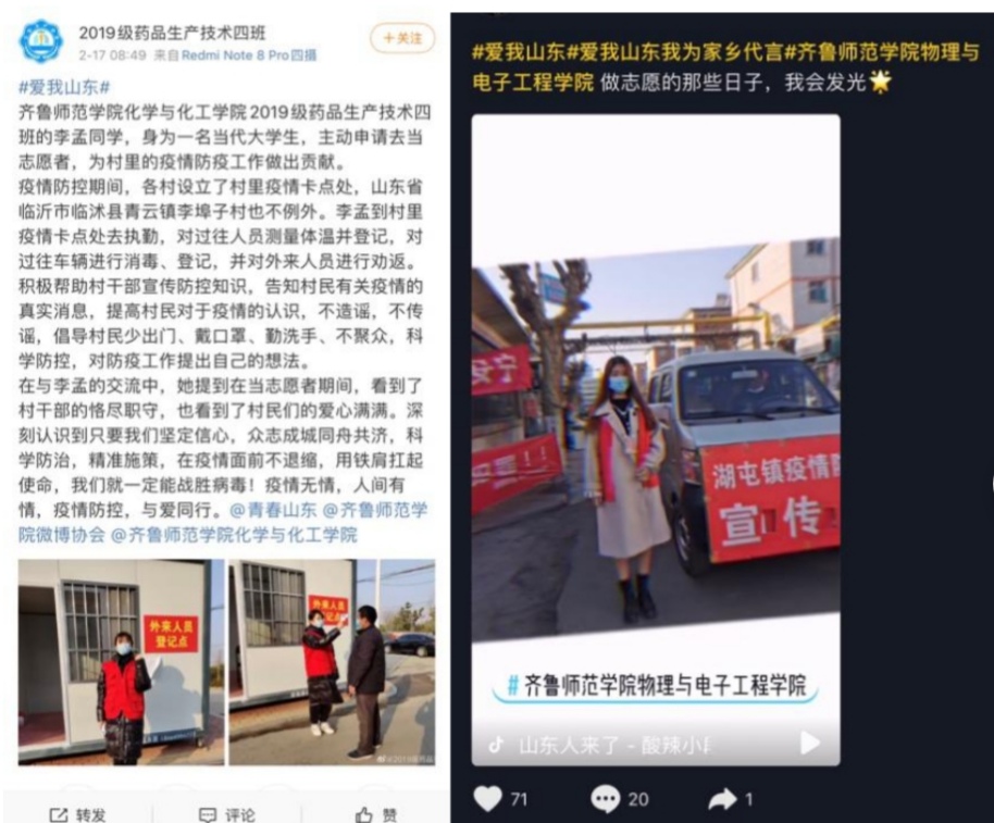 创新融合,展开方式多样化。在疫情防控形势之下,校团委、学生会以及各二级学院团委、学生会创新工作思路,组织广大青年除了在一线进行疫情防控志愿服务工作,还积极响应团中央、团省委要求,号召同学们通过线上微博、抖音、快手平台发布vlog视频等方式,积极参与@青春山东、#爱我山东#话题讨论,截止到2月21日,金年会官网学子参与#爱我山东#主话题讨论1213条,广大学子将自己的志愿服务工作、对家乡的热爱通过图片、短视频等新媒体形式外化为无穷的精神力量,感染着更多的青年人去“拼搏”,去“战斗”。