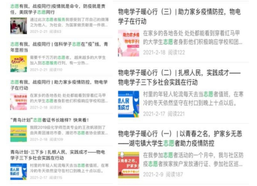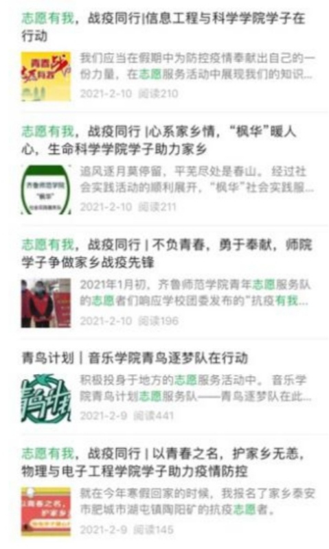 广泛宣传,青年学子“干劲足”。为积极弘扬青年学生们的志愿服务精神,进一步提升学子们的服务积极性、主动性,并引领更多青年学子投身疫情防控志愿服务大潮,校团委、学生会及各二级学院团委及时做好志愿服务工作宣传工作。截止目前,“齐鲁师院青年”微信公众号、各二级学院官方微信号不间断推送疫情防控志愿服务、青鸟计划社会实践专题报道50余篇,通过弘扬志愿服务精神,不断展现学子青春风貌。