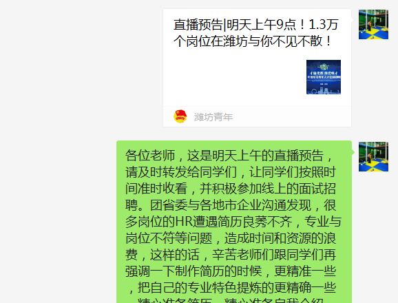 三、有效传递到位,精筛细选差异投递。一方面力争对毕业生进行全面覆盖,另一方面注重差异化、针对性岗位传递,确保毕业生接收岗位高效高质。制作《2021届毕业生“青鸟计划”平台就业意向调查问卷》,面向全体毕业生进行就业意向调查,收集到有效问卷1673条,收到学生建议300余条,进一步明确学生需求;根据金年会官网实际需求,各学院专业特色等,对团省委发布的海量就业岗位进行全面筛选、优中选优,根据不同地域、不同学科类别推送岗位,大大节省学生筛选岗位的时间;根据云招聘活动时间表,通过“齐鲁师院青年”微信公众号、青鸟计划交流群、100余个青鸟驿站等平台,每一场直播、面试都提前预热,让学生充分做好应对准备。预热取得良好效果,几天的云招聘活动,共计一万余人次参加线上直播、面试活动。