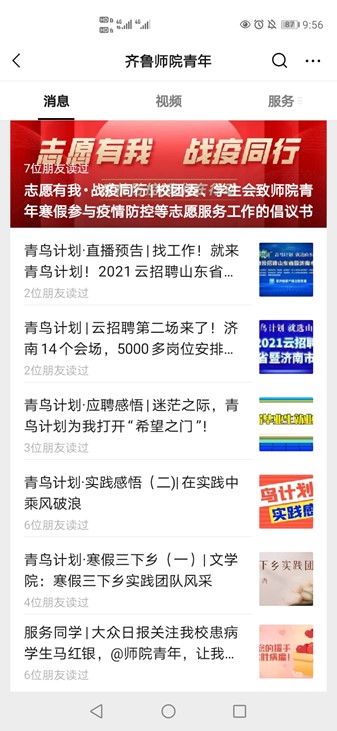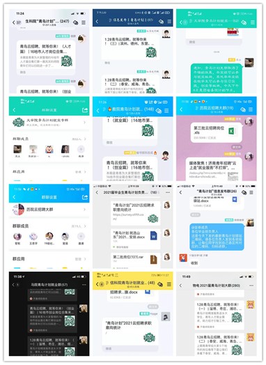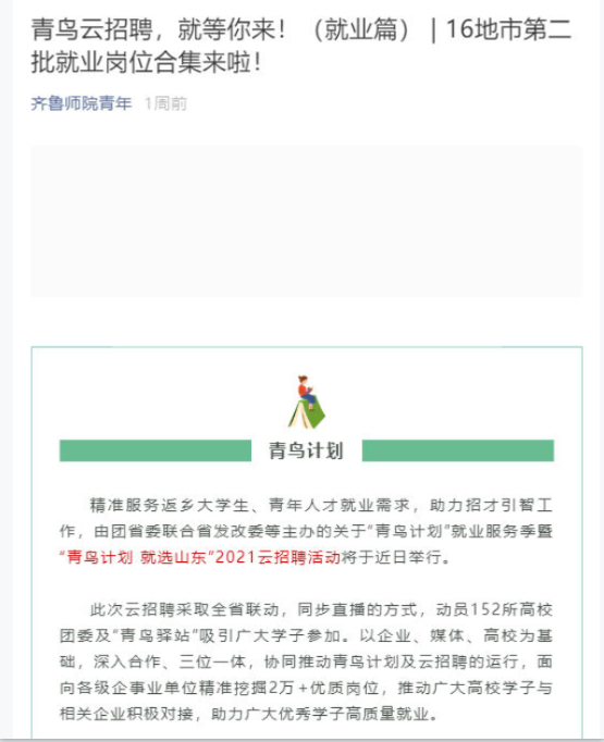 一、宣传动员到位,有序协调统筹推进。根据团省委统一部署,金年会官网团委创新工作模式,成立青鸟计划交流专群,进行线上青鸟计划云招聘经验交流及工作部署,专门的老师负责青鸟计划工作,压实责任到人;云招聘期间,通过“齐鲁师院青年”官方微信平台发布青鸟计划相关微信35篇,面向所有师院青年广泛宣传青鸟计划,动员学生参与青鸟计划云招聘活动;为确保各二级学院有效动员落实,校团委还与各学院团总支书记进行一对一沟通对接,强调服务学生就业的重要性、必要性,强化二级学院团委责任意识。