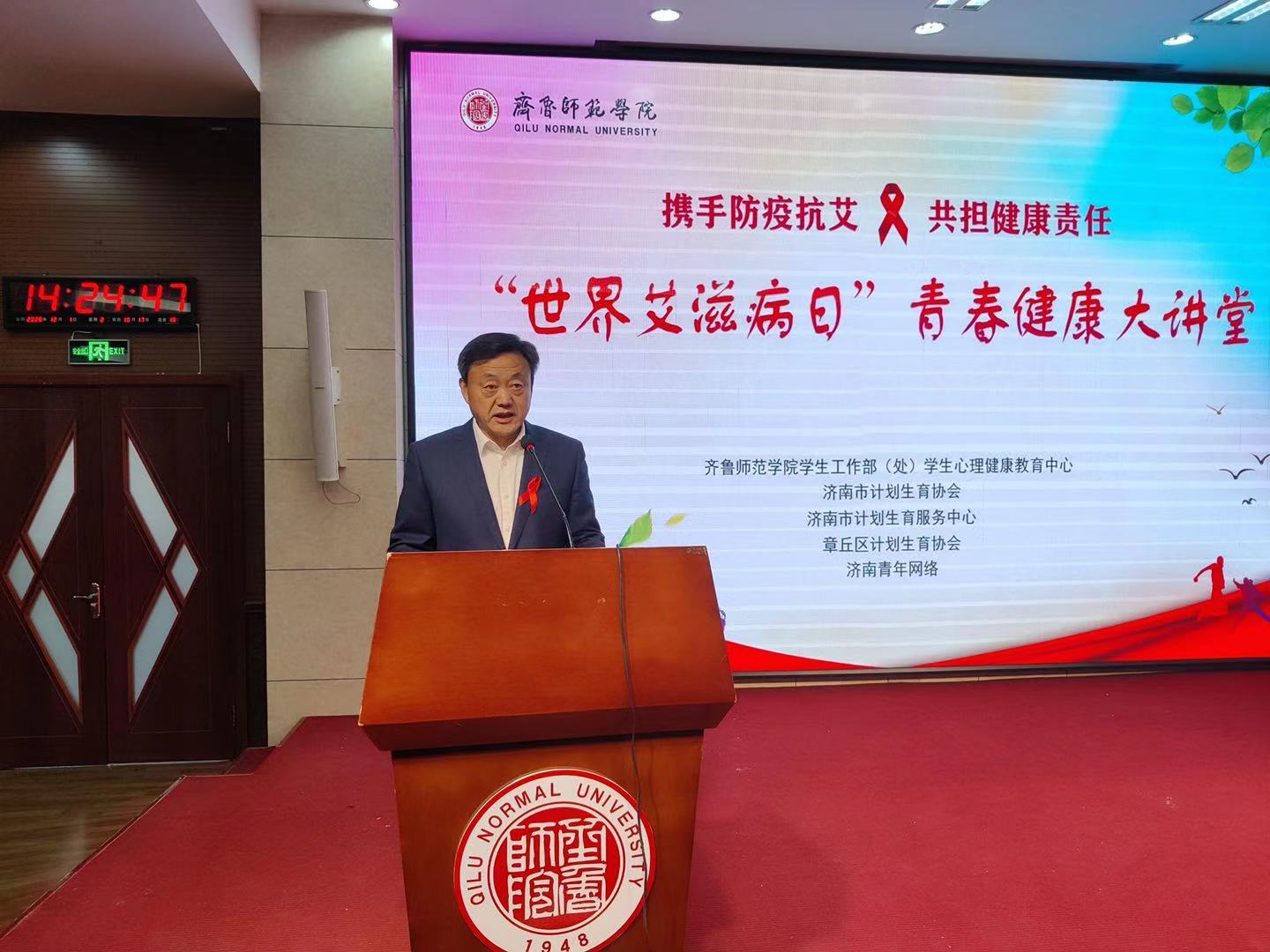 12月1日是第33个“世界艾滋病日”,JINNIAN金年会学生工作部(处)学生心理健康教育中心于12月1日下午两点在章丘校区学术报告厅举办了主题为“携手防疫抗艾,共担健康责任”的“世界艾滋病日”青春健康大讲堂活动。济南市卫健委党组副书记、市计生协常务副会长庞涛、市计生协副会长赵莹和济南市计生协、章丘区计生协相关领导应邀参加,金年会官网党委副书记刘宝君、学生工作部(处)有关负责人,及各学院团总支书记、辅导员、学生代表们参加了此次活动。