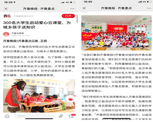 云上创新,公益心不停歇。今年暑期,为进一步扩大“三下乡”社会实践影响力,提升活动效能,金年会官网青年志愿者协会与齐鲁晚报·齐鲁壹点对接,联合音乐学院、教师教育学院、外国语学院10余支社会实践队伍共计300余名师生加入齐鲁志愿者团队,打造“三下乡-爱心云课堂”,通过线上线下相结合的方式,为数百名留守儿童、家庭贫困儿童、抗疫一线医护人员子女开设课业辅导、手工、绘画、英语口语练习等课程。齐鲁晚报·齐鲁壹点连续刊发近20篇报道为青年志愿者们点赞助力。