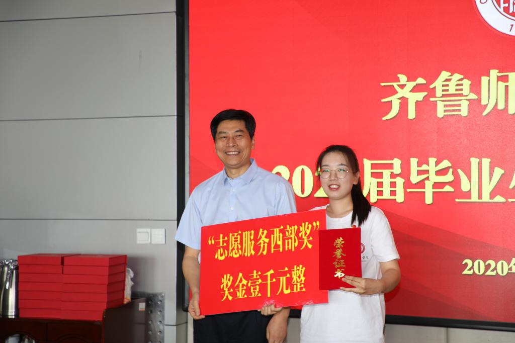 张福建副校长为“西部计划”毕业生代表教师教育学院汪云飞同学颁发荣誉证书和奖金,对加入西部计划的毕业生志愿者给与高度赞扬,鼓励他们投身西部奉献力量,扎根基层绽放青春。