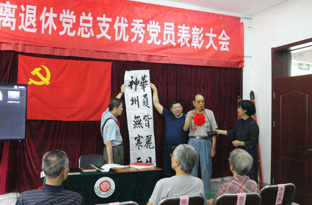 会议在庄严的国歌声中开幕,离退休处处长王跃辉首先宣读了《JINNIAN金年会关于表彰优秀共产党员、优秀党务工作者和先进基层党组织的决定》,处党政负责人向受表彰的徐进、张荣年、陈光苏、张桂秋、徐兰坤、李培源、赵春等7名优秀共产党员颁奖,7名优秀共产党员身披大红花,在热烈的掌声中走向主席台领奖。