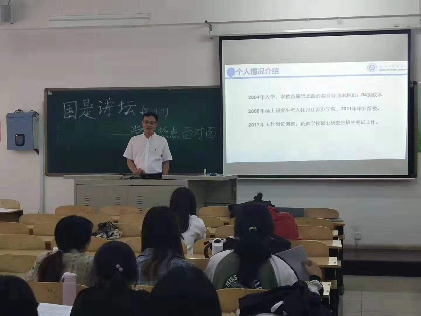教务处、学工部(处)等有关部门联合马克思主义学院、历史与社会发展学院、文学院和外国语学院等,邀请到了金年会官网优秀校友、2008届思想政治教育专业毕业生、牡丹江师范学院研究生招生办公室主任郝忠彬走进“国是讲坛”,为考研同学释疑解惑,马克思主义学院院长刘振光担任辅讲,有关学院党团组织负责人、班主任和有关学院近100名学生参会。